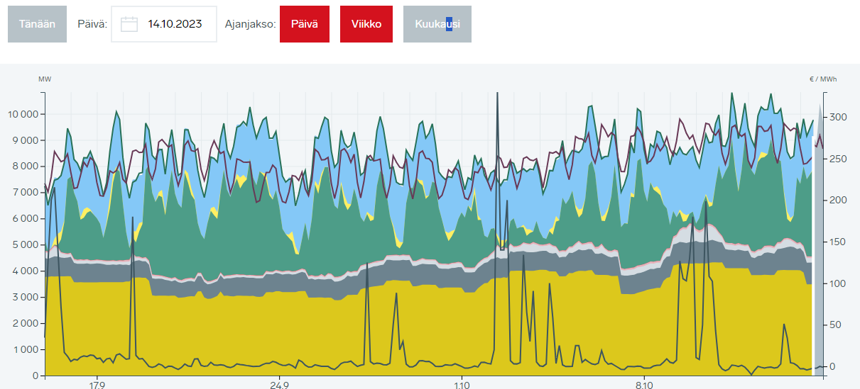 Ei mitään erityistä uutisoitavaa, mutta kuukauden mittainen sähköntuotanto-, ja hintadata kertoo, että hyvin on tuullut ja hinta on muutamaa korkeamman hinnan piikkiä lukuun ottamatta nollan tuntumassa. Näin kun tuota hintakäyrää katsoo, asettuvat iltalehtien otsikot korkeista sähkön hinnoista omaan arvoonsa. Kertoo muutenkin iltalehtien journalismin tasosta. ![]()