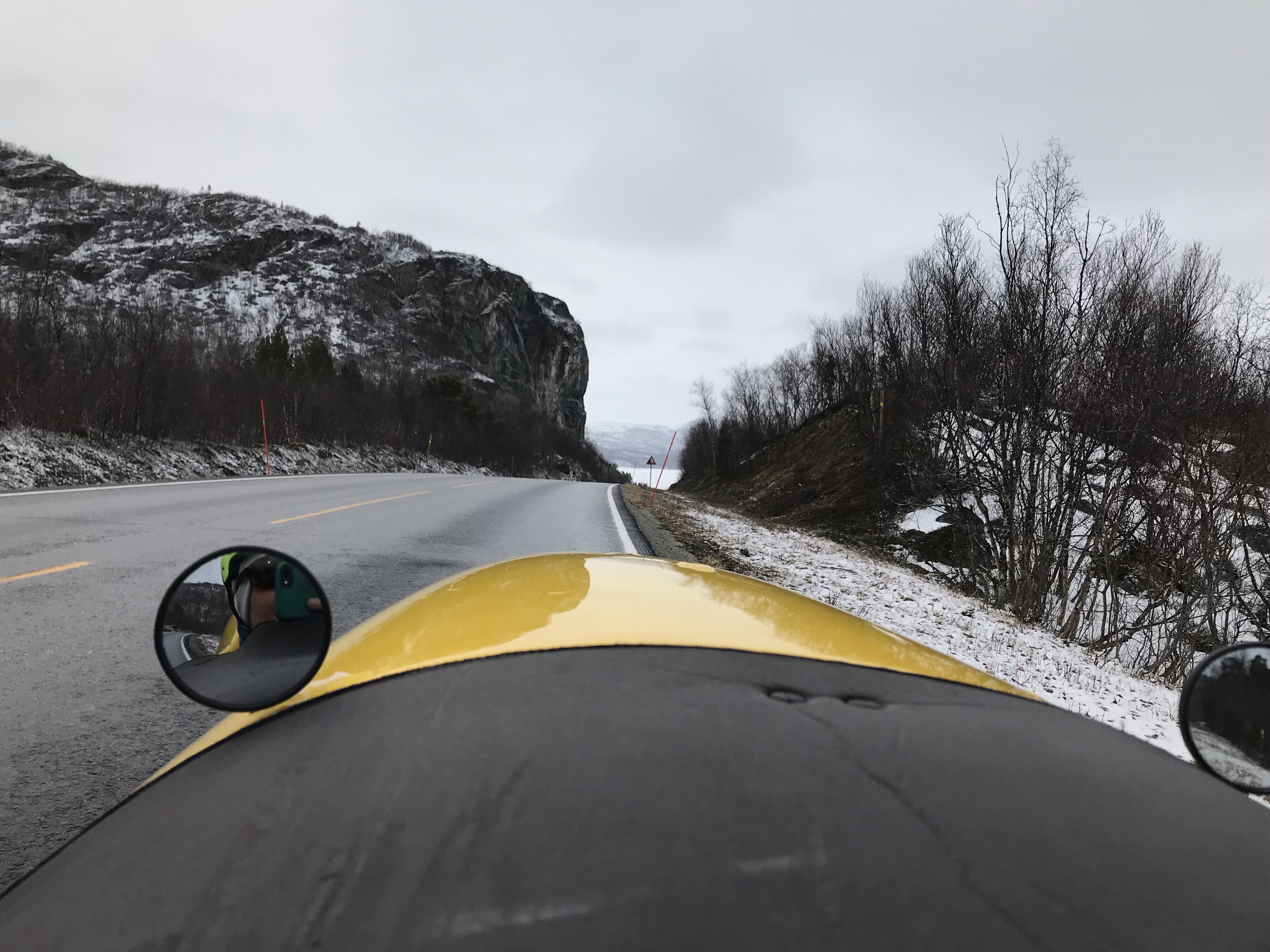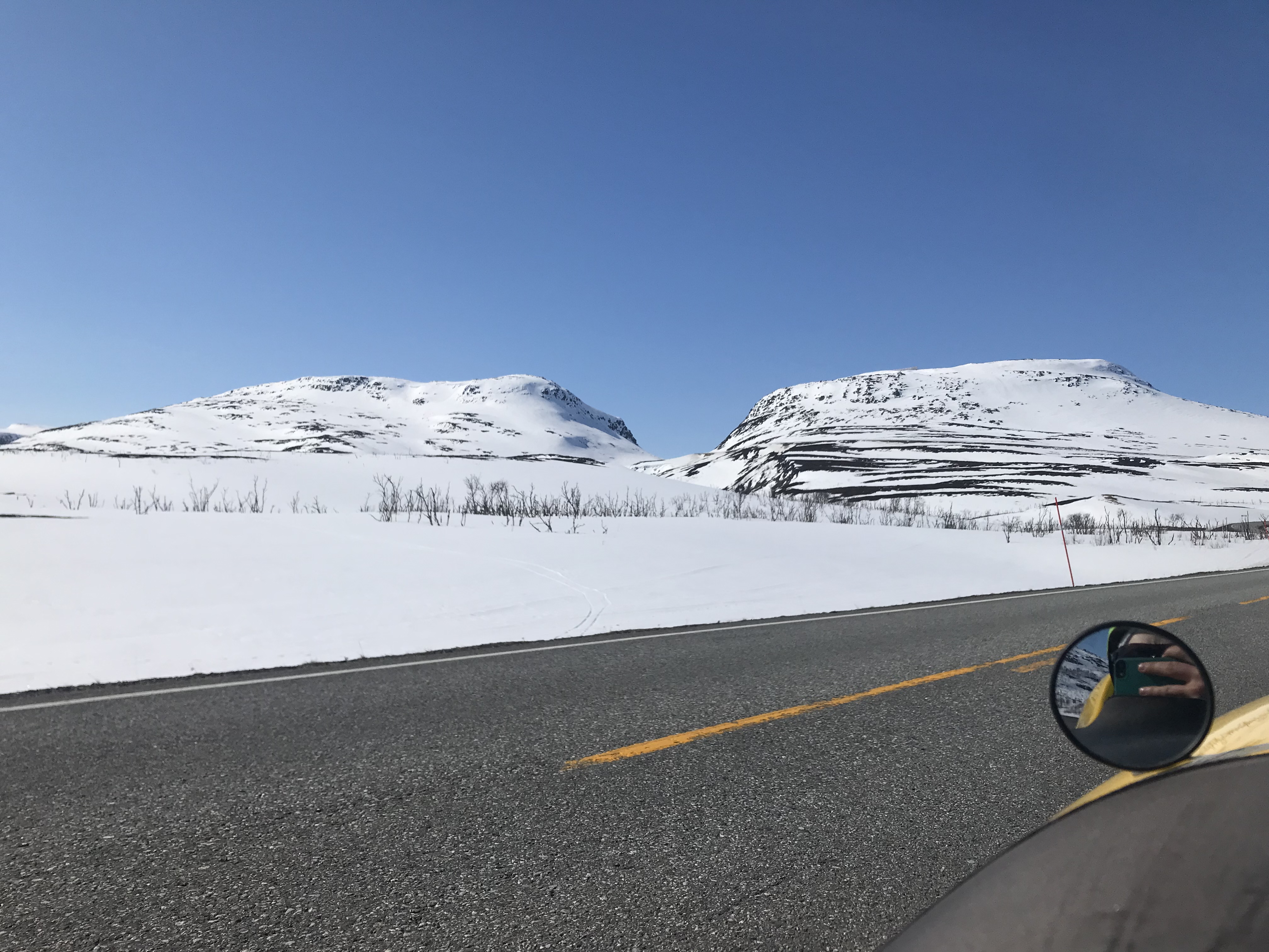 Ylhäällä on paljon pilkkijöitä. Norjalaiset käyvät Ifjordfjelletillä kuulemma vielä juhannuksenakin pilkillä. Tuuli on paikoitellen kinostanut tielle lunta, mutta kertaakaan en jää jumiin kesärenkaineni.