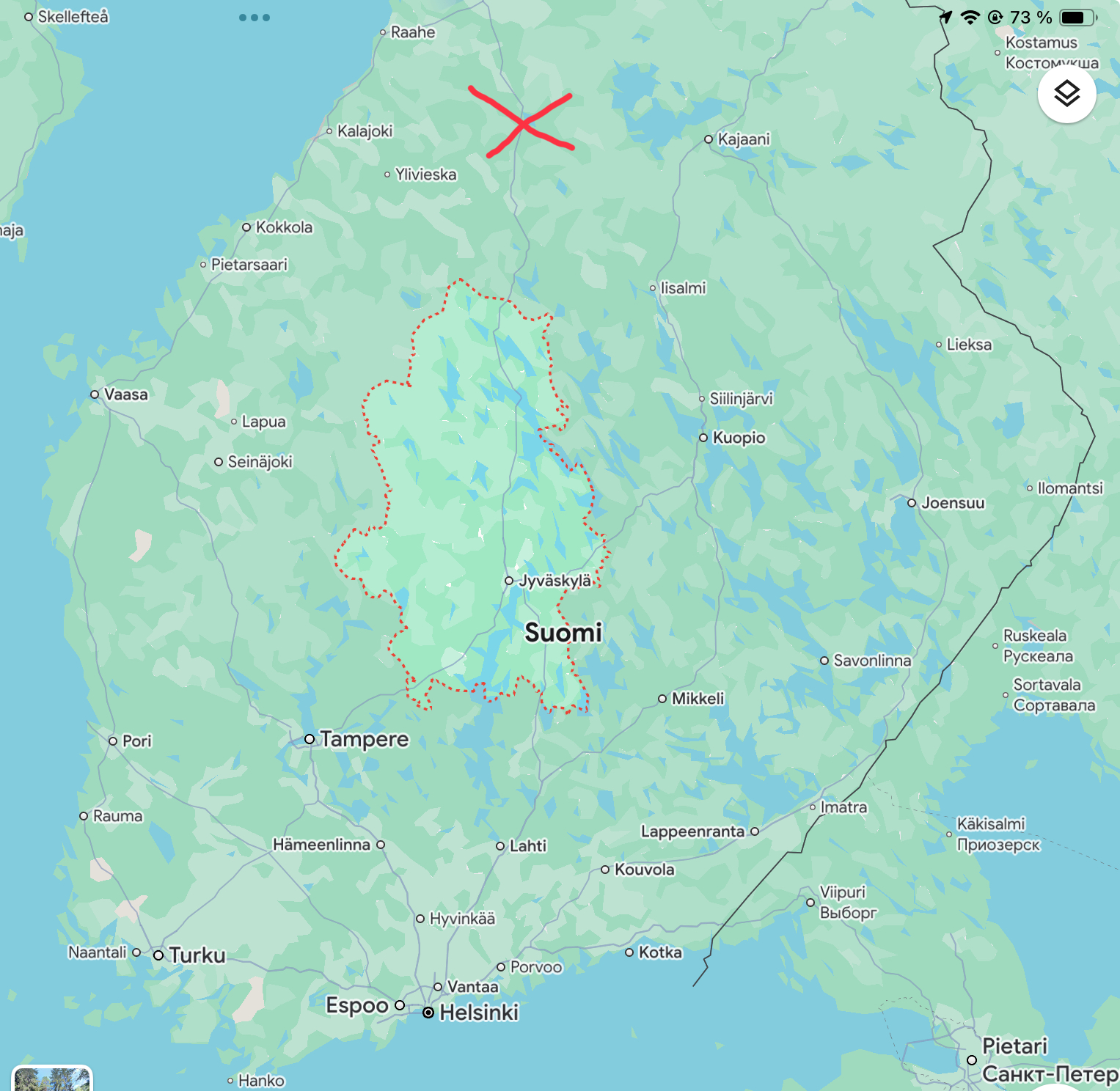 Kartassa on pisteviivalla ympyröity Keski-Suomi. Selvä, mutta miksi Suomen keskipiste (punainen rasti) on ylempänä?