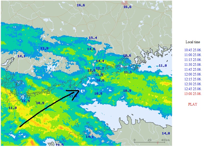 Sääennuste näyttää pitävän paikkansa. Tuo sadealue liikkuu noin 20 km/h nuolen suuntaan...