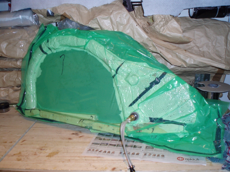 Ajattelin että muoto tulee tarkemmaksi ohuella levyllä, varsinkin kriittisessä nokassa tarkka muoto tarvitaan, ei ole liikaa jaloille pyörimistilaa. noin 2/3 plugista olisi kyllä voinut leikata vaikka 5-10 cm levystä muodon kummennin kärsimättä. jouduin kuitenkin vähän korjaamaan perää ja olkapäiden aluetta, totetutunut muoto ei ole täysin sama kuin tietokoneella. Mutta näyttää hyvältä ja nopealta silmään, mikä on vähintäänkin yhtä tärkeää :mrgreen: