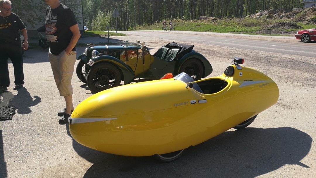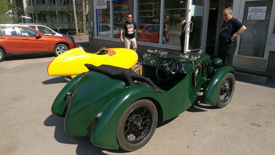 Autourheiluliikkeen eteen parkkeeras tuttu autoharrastaja Austin sevenillään. Kaksi ääripäätä, alkupään auto ja tulevaisuuden kulkupeli - tämä siis autoharrastajan suusta
