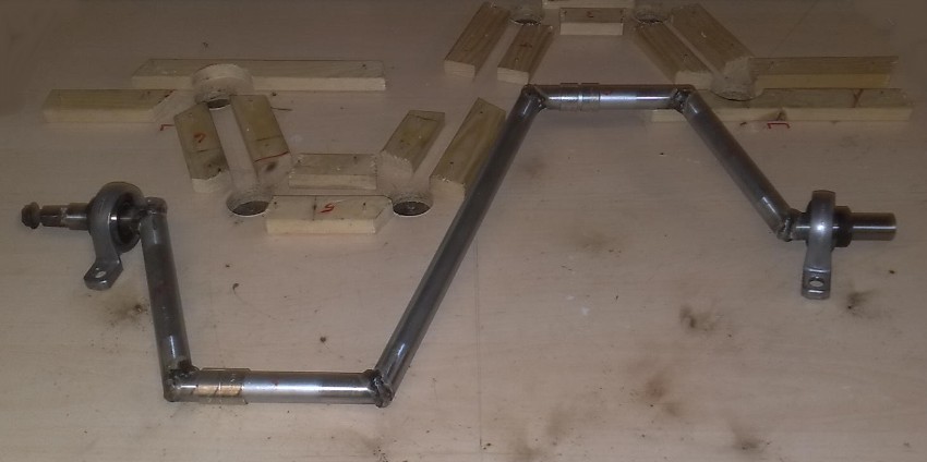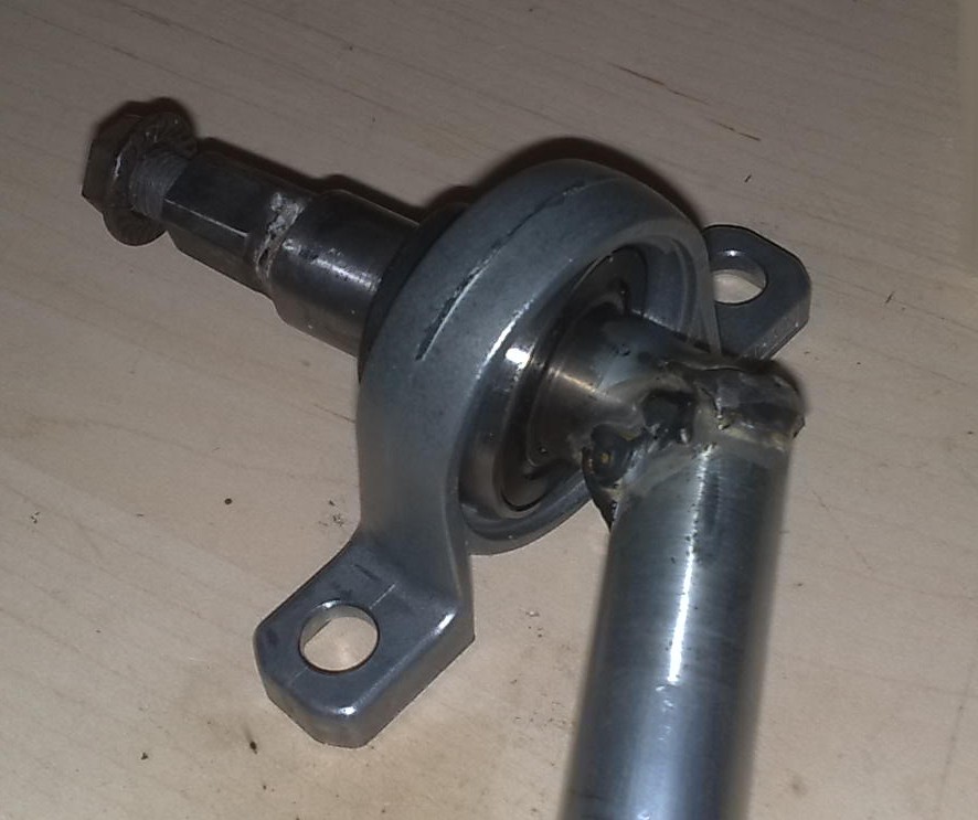 Eilen illalla sitten opistolla hitsasin kampiakselin. Tuli kohtalaisen suora. Opistolla sain vihjeen hankkia laakereiksi pallolaakerit, jotka löytyivätkin paikallisesta Toivola Team Oy:stä ja joiden avulla akselin kiinnitys runkoon käy mukavasti.