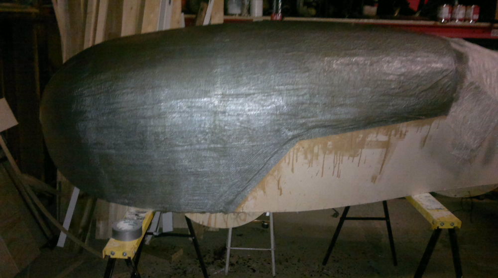 Tänään laittelin kerroksen lasikuitua teipatun osuuden päällä. Harmittavasti vain hartsi loppui kesken...saa nähdä riittääkö tuo jäykistämään rakennetta sen verran, että voin ruveta pakkeloimaan muottia.