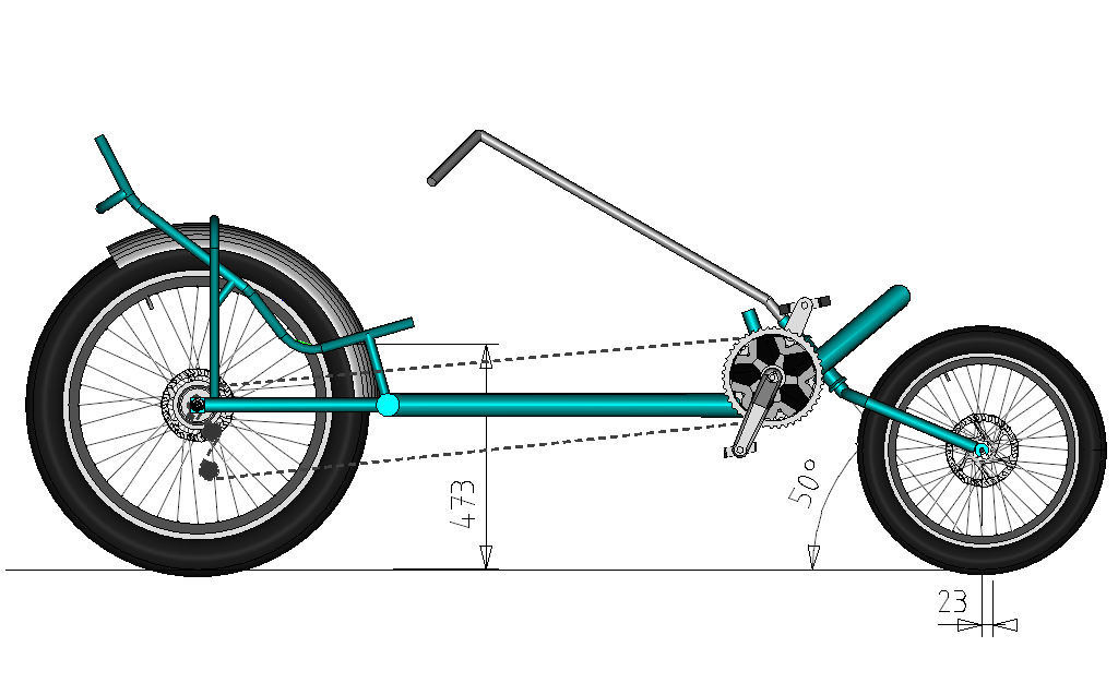 Taittopyörä on liian edessä. Ketjun pitää mennä taittopyörän yli ja pudota siitä madollisimman tarkasti ohjausakselin kanssa yhdensuuntaisesti kohti vetävän rattaan takatangeerausta. Tämä siksi, ettei ketjuvoima vetele ohjausta. Nyt tuo taittopyörä on niin edessä, että jollei ketju hankaa haarukan oikeaan olkapäähän, vetää se ohjausta joka polkaisulla vasemmalle. Viisi senttiä taaemmas on hyvä määrä.