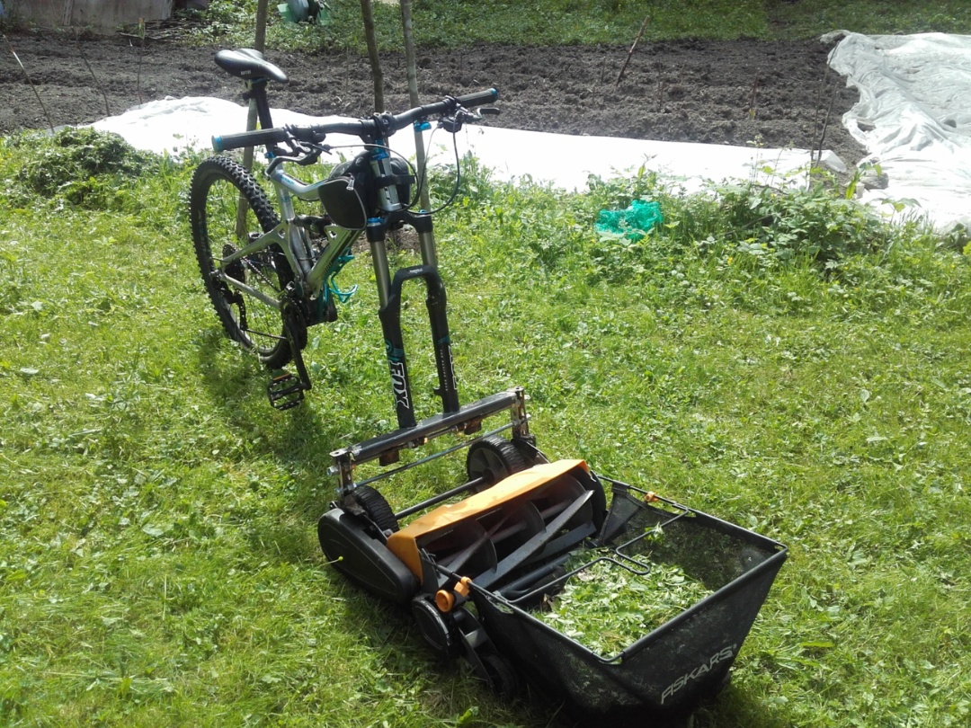 Hyvää tuossa on kun ei tukehdu paksuun ruohoon ja renkaat pitää liikkeelle lähdössä (pitkässäkin ruohossa) koska nyt painoa renkailla on tarpeeksi.