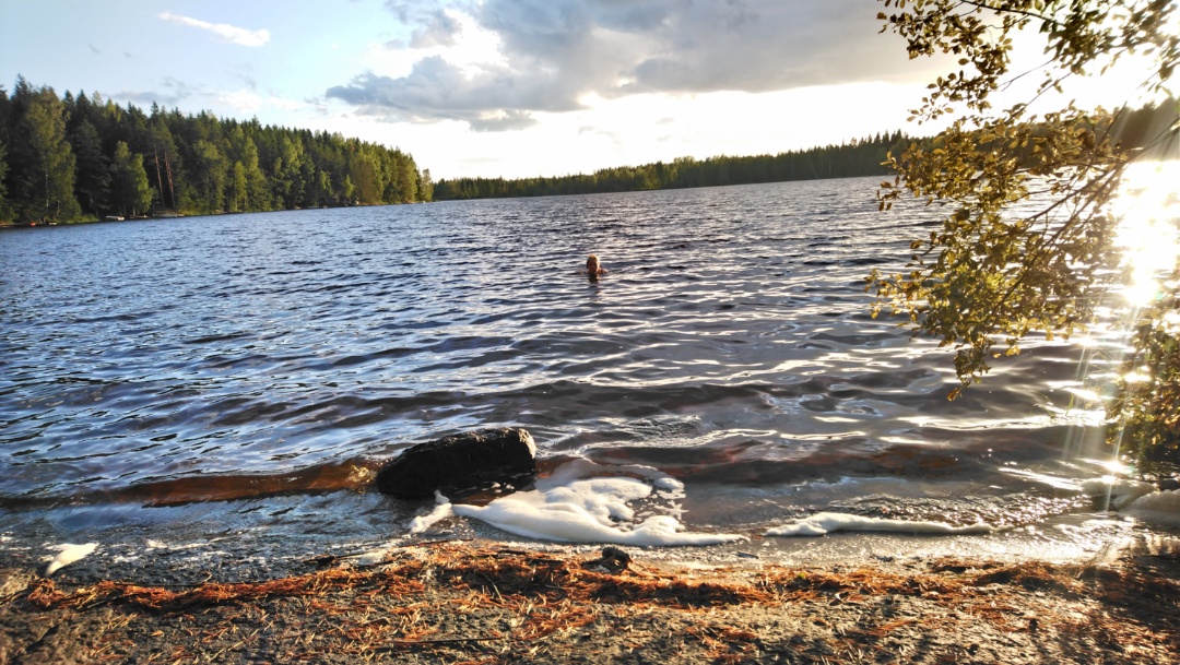 Kappaleenmatkaa taas eteenpäin ja päädyimme levähdysalueelle missä oli uimaranta. Tämän olin katsellut etukäteen kartasta ja hahmotellut, että olisi sopivalla etäisyydellä yöpaikasta jos haluaa vähän peseytyä ja Saila tykkää uida ennen iltaa. Mennessä aurinko oli pilvessä ja näytti kylmältä mutta auringon tultua esiin ei edes tuuli tuntunut kylmältä, vesi oli vielä todella lämmintä. Vähän sellainen hylätty fiilis jäi rannasta vaikka (ainakin joskus ollut) on virallinen uimaranta.