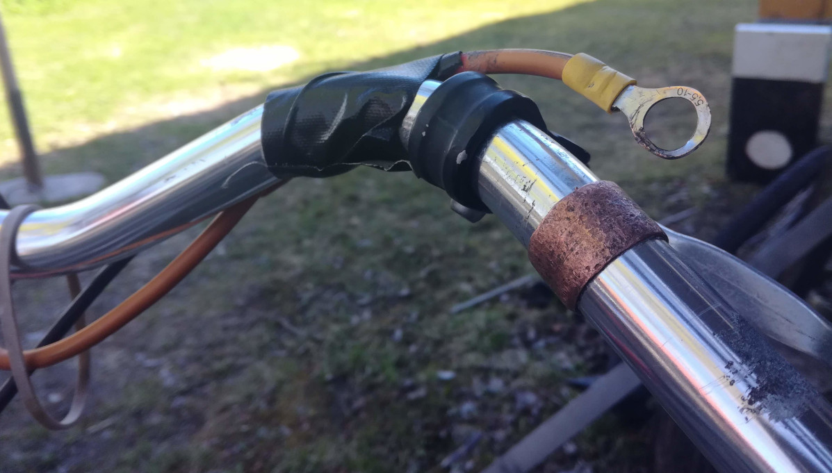 Tangossa näkyy mustana entisen jarrukahvan paikan aikana muodostunut sähkönkytkentäkohta, joka karheutensa ja alumiinioksidin takia välillä kipinöi näyttävästi, kun läksin valoista. 8)