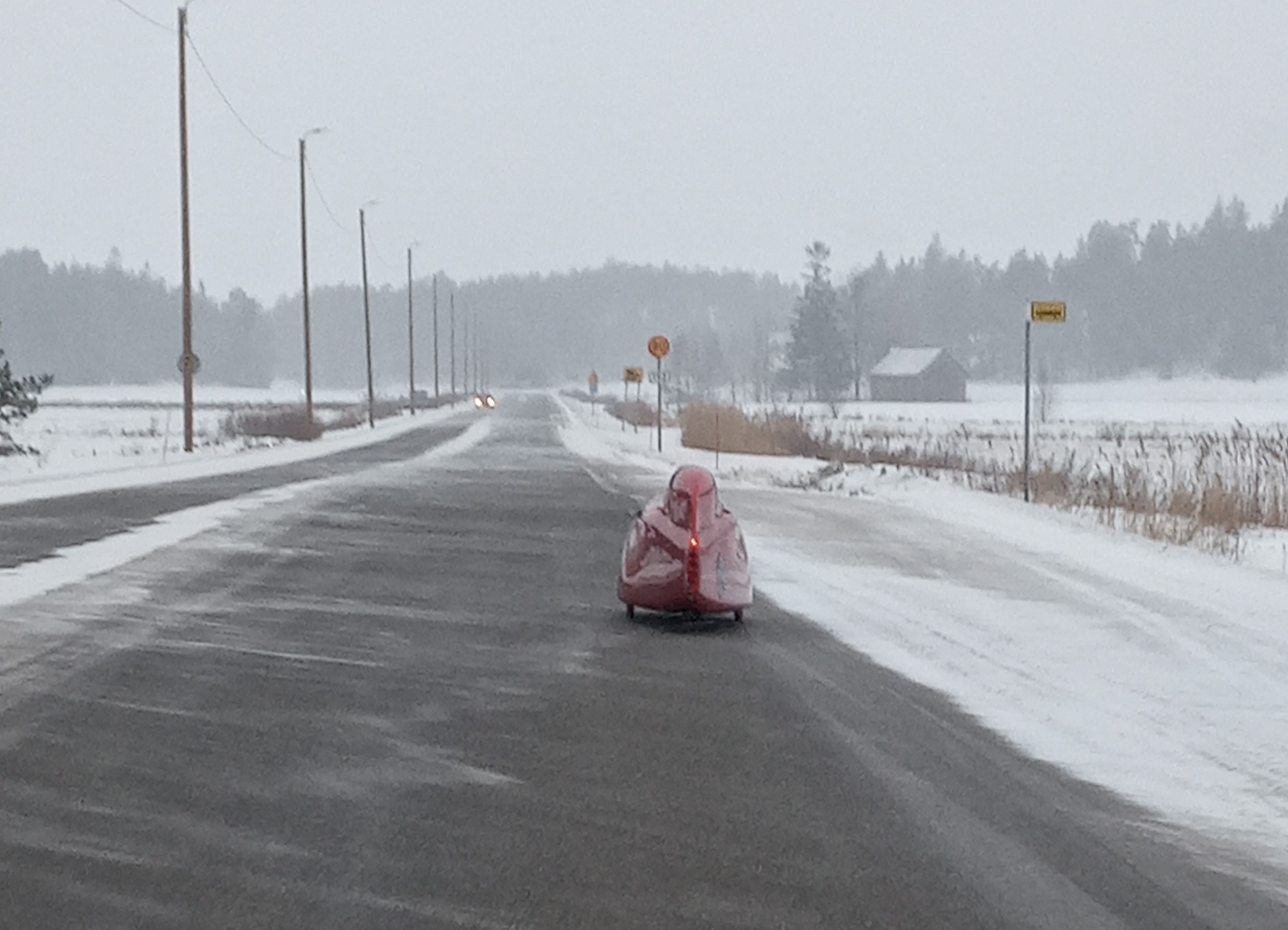 Enpä tiedä kinnerikeleistä -10 näytti mittari ja lunta tuli vähän, sekä tuolla tiellä melkoinen sivutuuli, mutta eteenpäin näkyi menevän melko vauhdilla vaikka tie oli melko liukas.