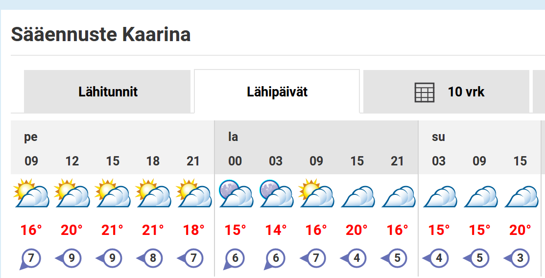 Ystävällistä ja auttavaista palvelua Ilmastotieteenlaitokselta! Sadekuuro siirtyi ennusteessa eilisen mittaan aina vain aiemmaksi ja nyt näyttää pelkkää aurinkoa tällle päivälle.