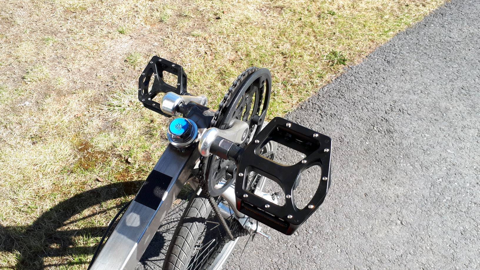 Hommasin kokeeksi piikkipolkimet, jospa nuilla vois polkea sandaaleilla. Kääntyväkeskiöisessä huono jalka ei varmasti pysy lukottomalla polkimella, mutta tässä jäykkäpuomisessa vois olla pieni toivo.