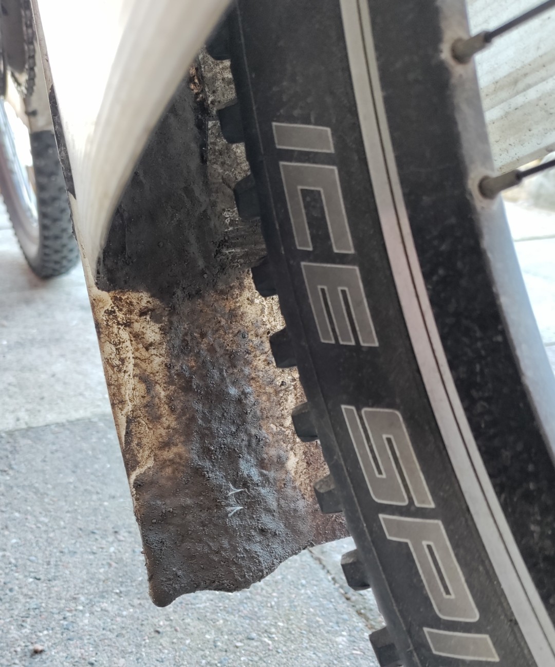 Ice Spikereista on hajonnut nastoja. Karbidipiikki näyttää katkenneen, ja sen tynkä ja nastan runko on jäänyt paikalleen. Yhtään sepelin aiheuttamaa puhkeamista näillä ei ole vielä tullut, toisin kuin puhkeamattomiksi mainostettavilla Marathon Winter Plussilla. Korkeat nappulat suojaavat.