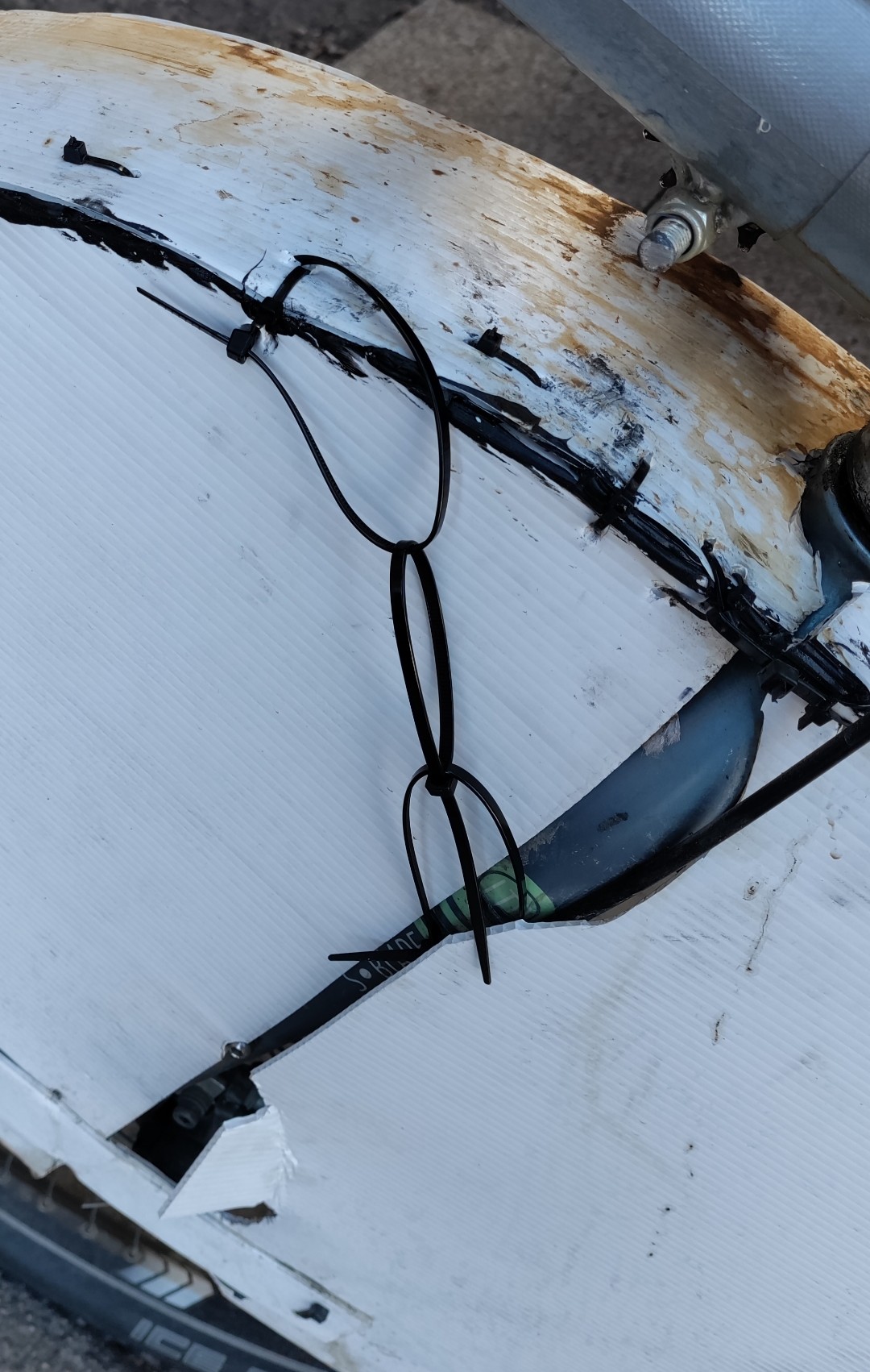 Takaketjun suojaksi tein varsin umpinaisen kotelon lasikuidusta. Kunnianhimoisena tavoitteena ajaa koko talvi koskematta ketjuun. Kotelon alaosa irtoaa tarranauhoilla, jolloin renkaanvaihto onnistuu.