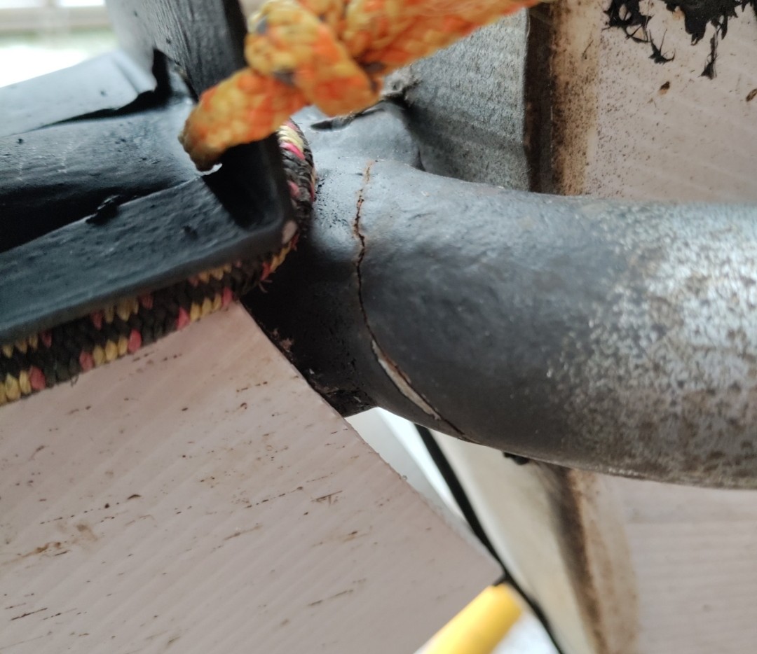 Runko on melkein poikki. Molemmin puolin pitkät halkeamat takahaarukkaputkien tyvissä. Kuvissa pyörä on käännetty ylösalaisin. Ajossa asian huomasi kunnolla vasta viimeisellä matkalla, kun kiihdyttäessä selkänoja tuntui liikkuvan oudosti. Toisioketju kai kiskoi taka-akselia alemmas ja sitä kautta liikutti myös selkänojaa. Tuo on suunnilleen se paikka josta tällainen runko tietysti hajoaa, jos se jostain hajoaa. Rungolle tuli noin 8000km ajoa.