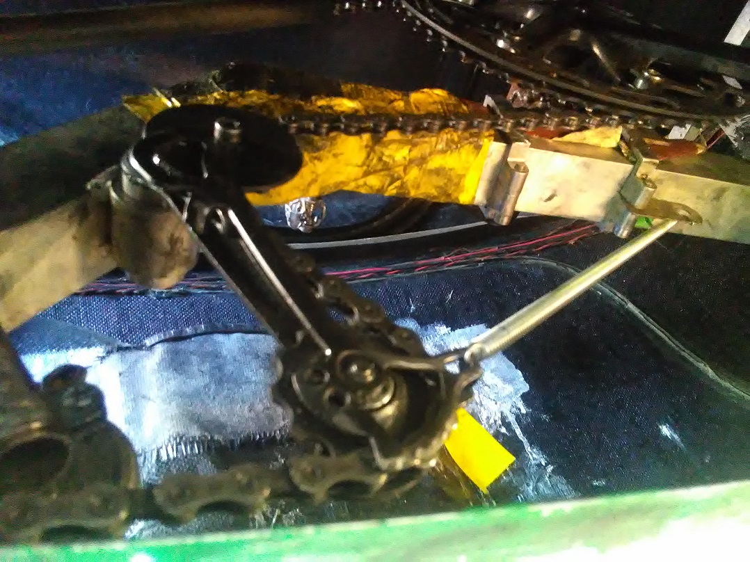 Ketjunkiristin ei enää pelannut ihan täysillä ja jos ketju jäi hetkeksi löysälle niin paluupuolen ketju löysi itsensä vääriin väleihin. Lisäsin yhden jousen ulkopuolelle kiristämään, tuntuisi toimivan.