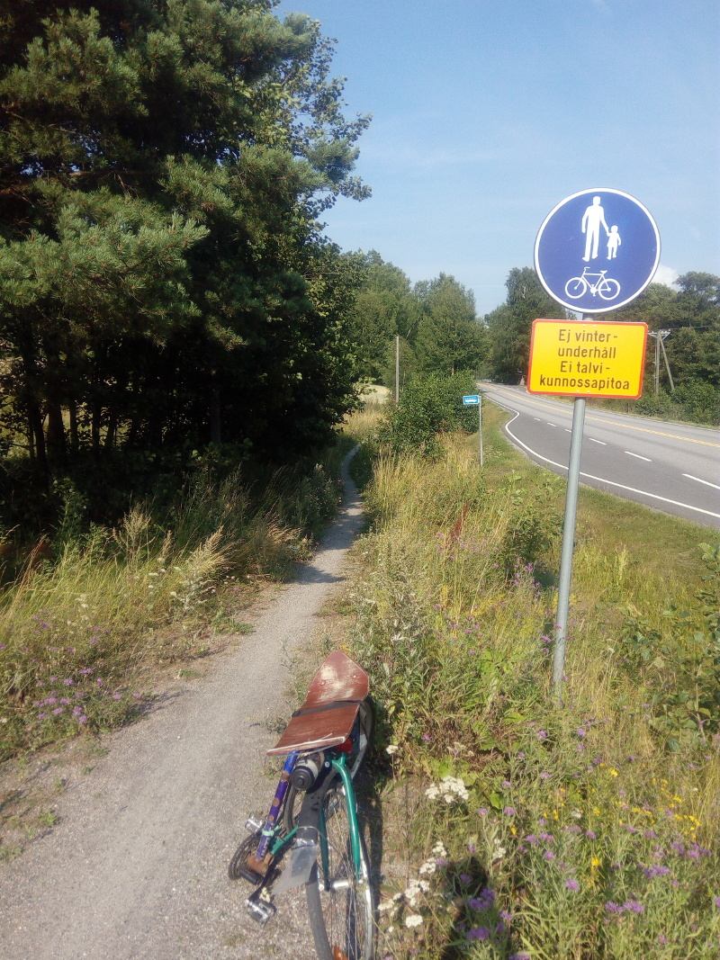 Paraisilla on omituinen käsitys pyörätiestä. Hyvä että yksi kaksipyöräinen edes mahtuu. Kohtaa tuossa sitten ketään tai aja kolmipyöräisellä. Paikoitellen oli vielä vesi juoksettanut mäissä syvät urat. Tielläkään ei saisi ajaa, kun pyörätie on olemassa Tätä markkinoidaan aktiivisesti pyörämatkailuun