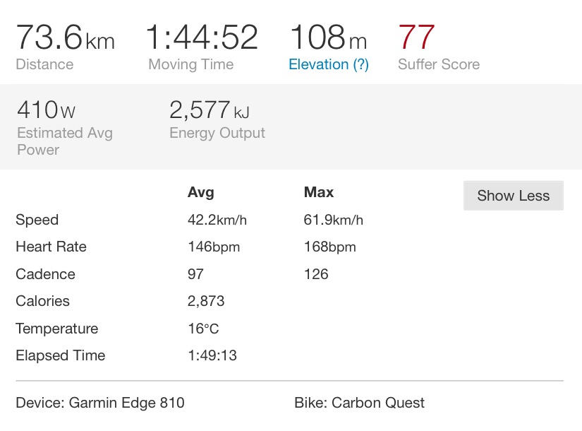 Tänään kilometrikisaan tuli nämä vajaat 74 kilometriä jotka yritin ajaa mahdollisimman kovaa. Keskinopeus oli 42,2 km/h. Ehkä se vähän lisää nopeutta :mrgreen: