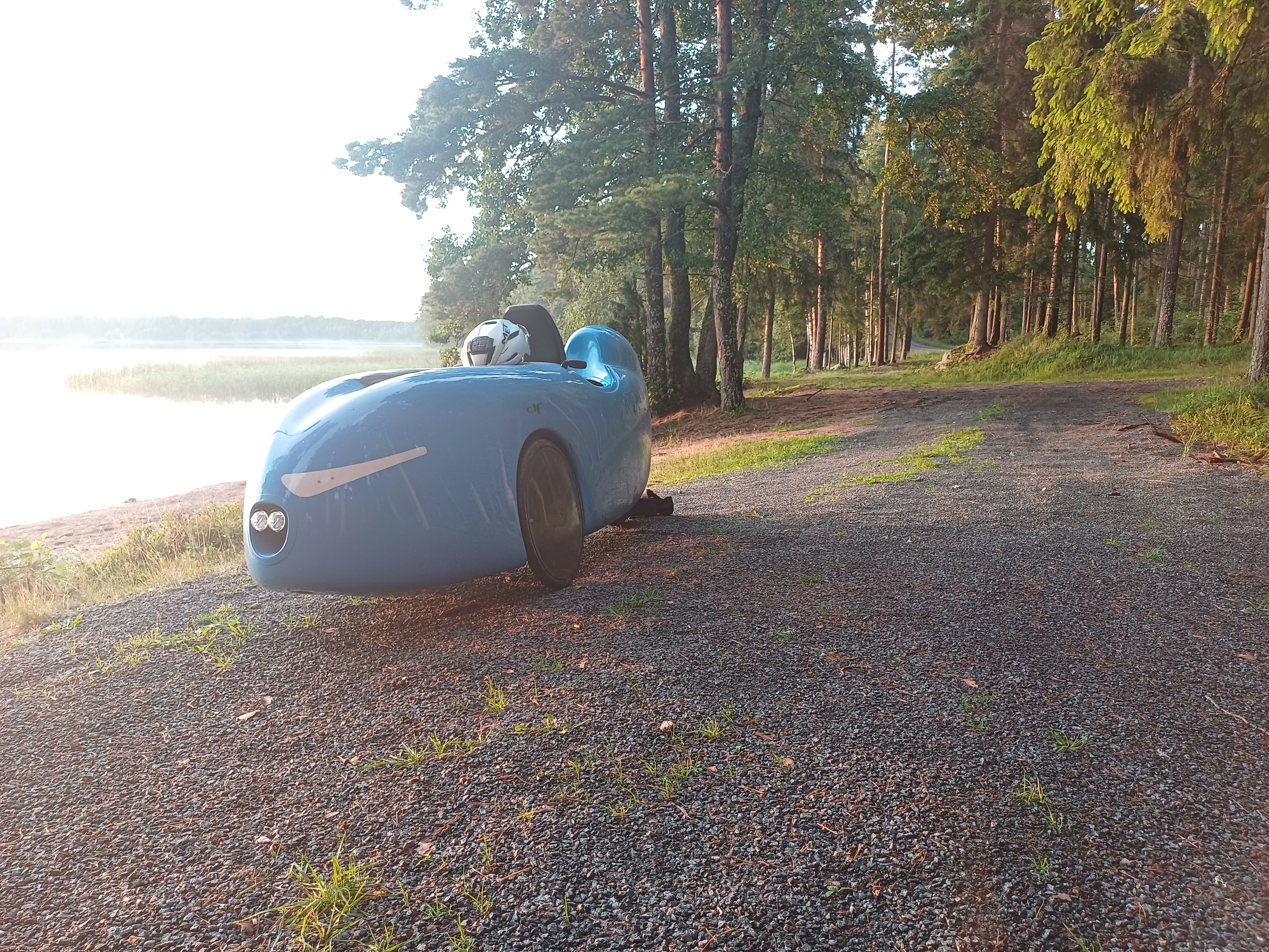 Reitti teki vähän tepposet, olin sen brouter.de:llä ja sen velomobiiliprofiililla tehnyt, mutta en kiireessä ajatuksella käynyt koko pätkää läpi, niin perskeles sehän laittoin minut sorateille kurvailemaan. Ihan hyväkuntosia oli kyllä, mutta sateen jäljiltä pehmeitä ja kinneri kulki kuin täi tervassa :) No ei siinä, maisemat oli monipuolisemmat kuin isommilla teillä.