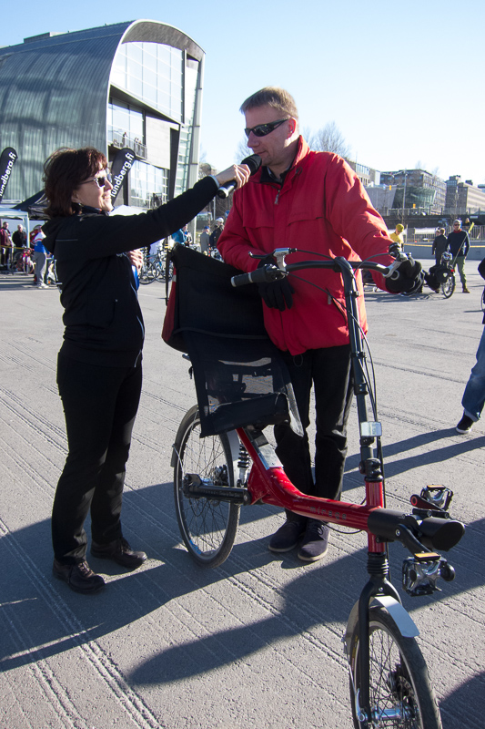 Tosiaan päivän valikoituminen ei olisi voinut mennä paremmin, sillä sää suosi toden teolla ja paikalla oli varmasti maksimimäärä pyöräilystä kiinnostuneita, koska samalla musiikkitalon takapihalla oli naisten pyöräilykilpailut. Muutamia nojapyöräilijöitä kävi joku täti mikin kanssa haastattelemassa. Hyviä puheenvuoroja kaikki. ![]()
