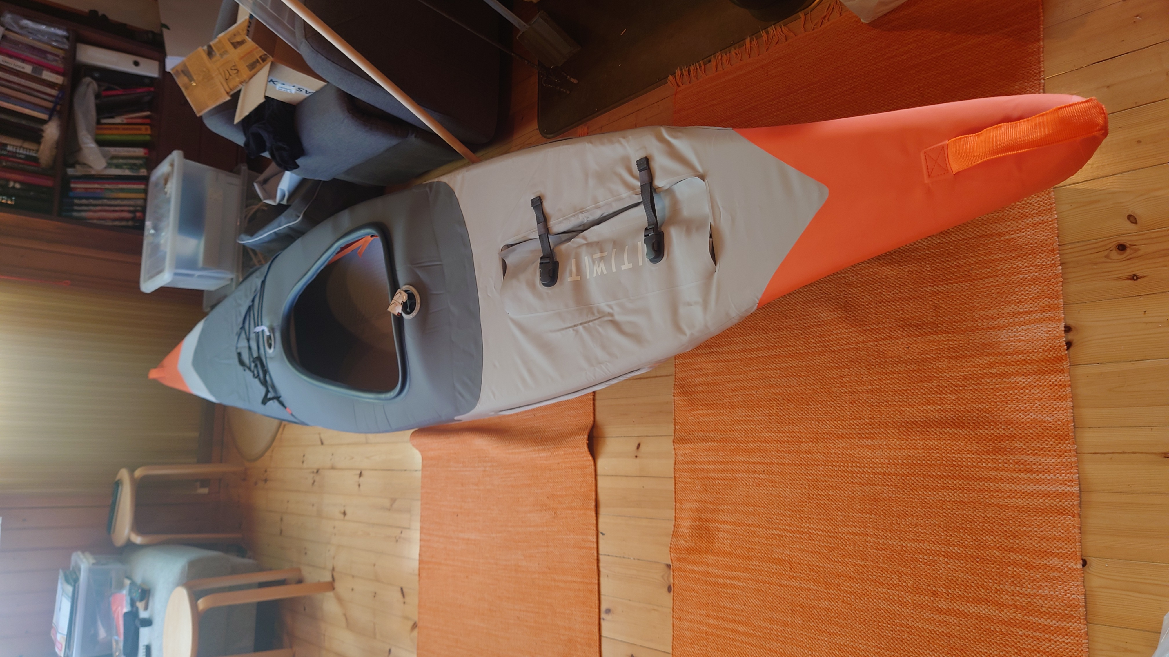 Hieno kajakki. Meillä on myös kangaskajakki, mutta putkirunkoinen. Kasaamiseen menee parikymmentä minuuttia. Kuva