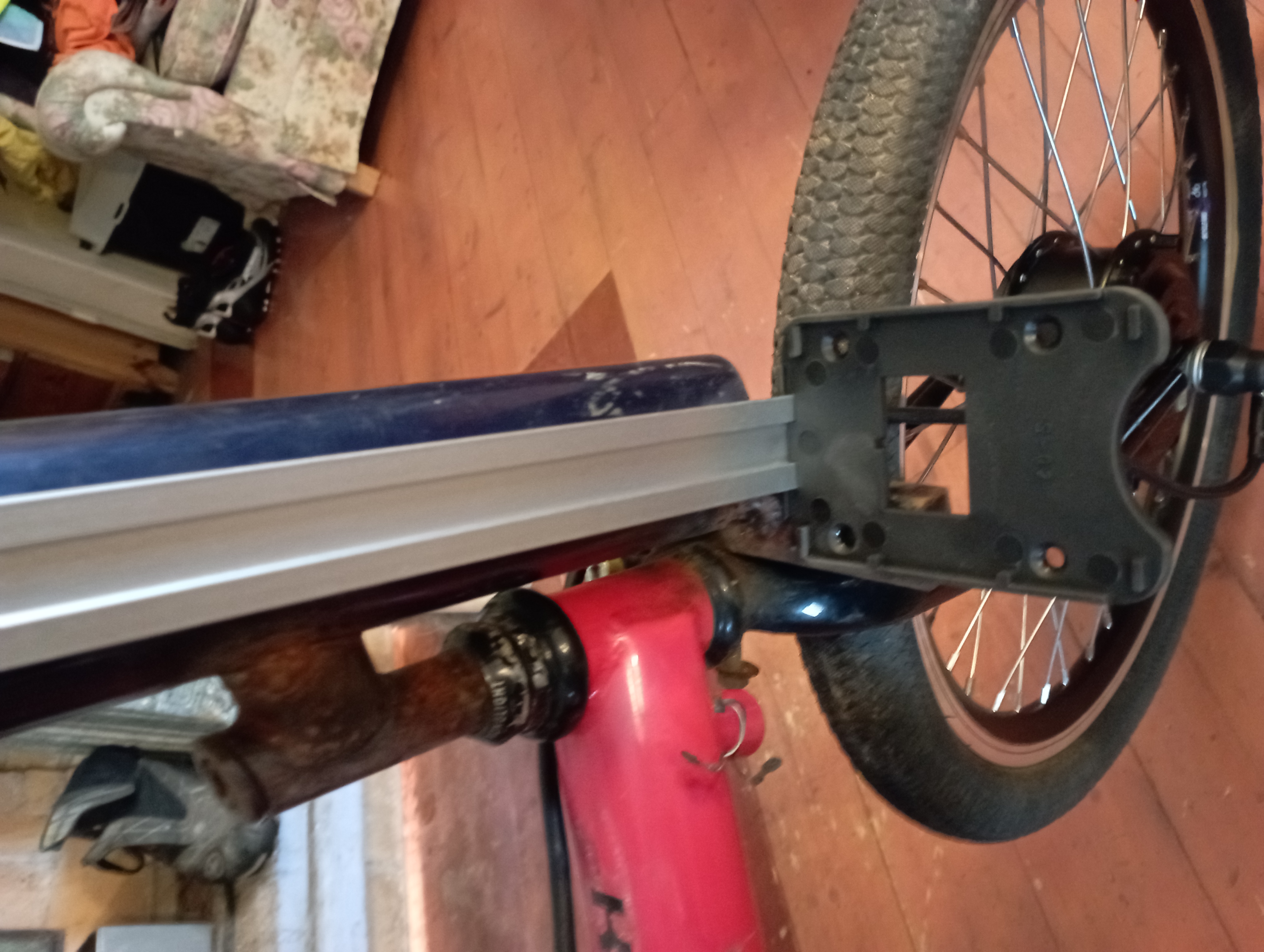 Kai sille telineelle pitää joku kiinnitys tuohon keulalle rakentaa. Keulassa on purjehduskokeilujen ajalta vielä mastonjalka paikoillaan - sen kylkeen teline.