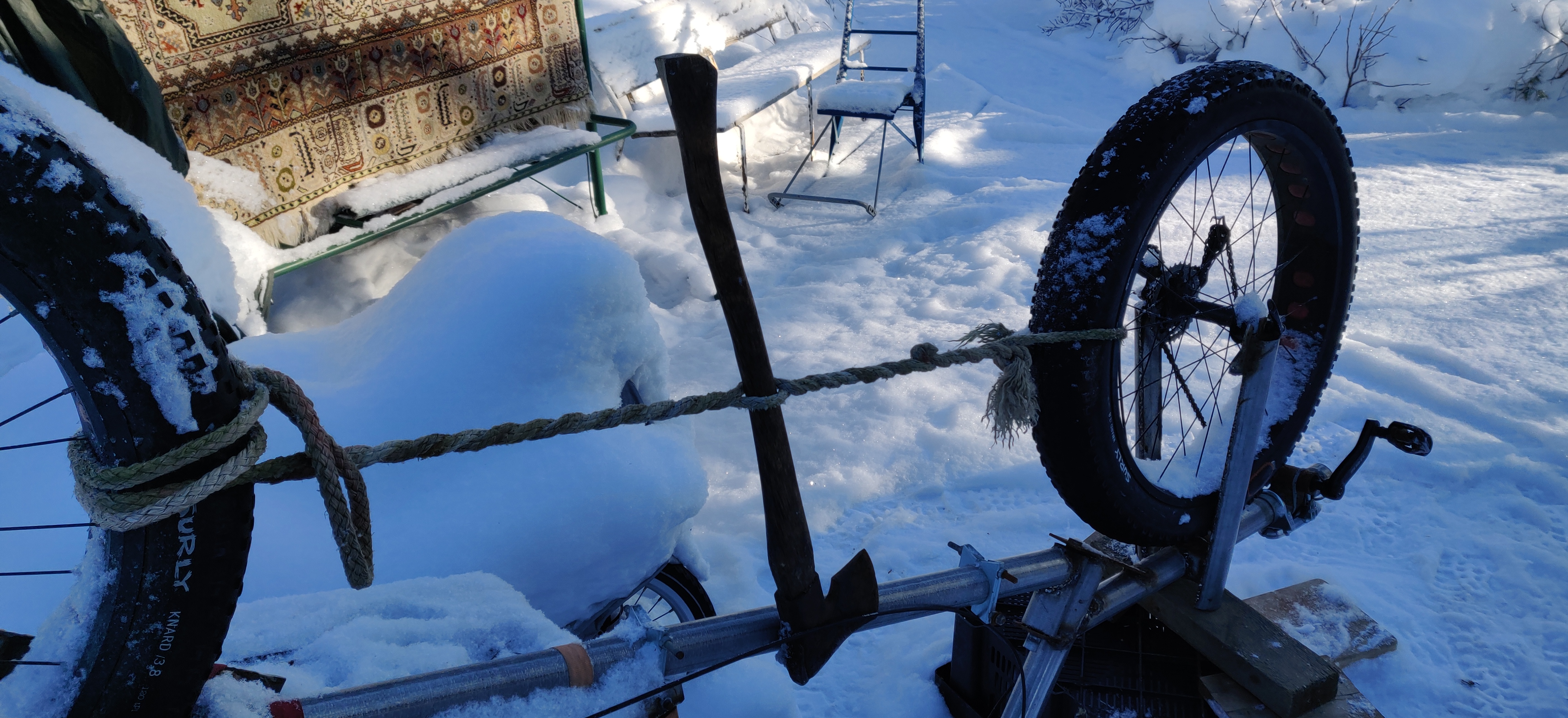 Oli kirveellä töitä ja narulla