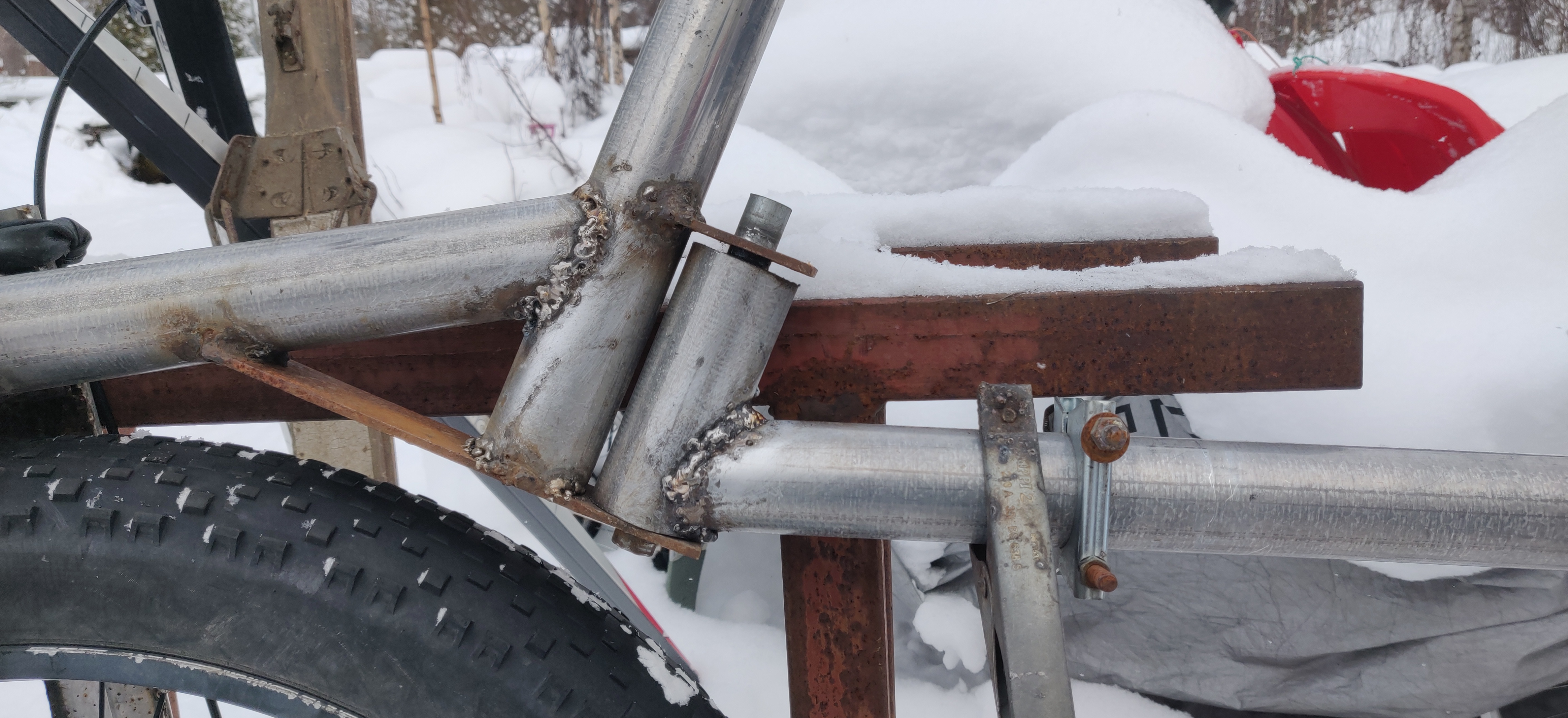 Omaan silmään rungon ja emäputken kulma näyttää kestävältä ilman tukikolmiotakin. Sauma oli alkujaan kiinni vain sivuilta, nyt alkaa olla ympäri asti. Mitäs se lujuuslaskentaosasto on mieltä?