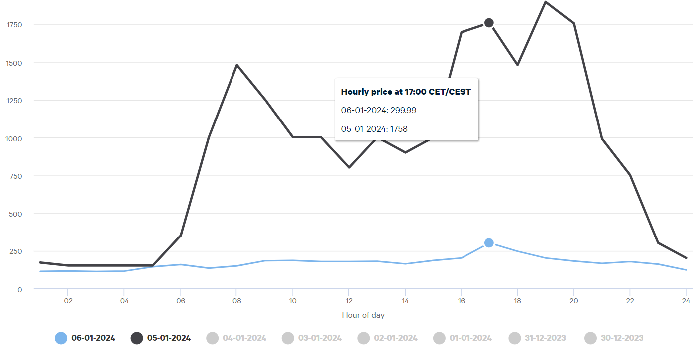 Tässä huomisen sähkön pörssihinnat sinisellä. Mustalla tämä päivä.