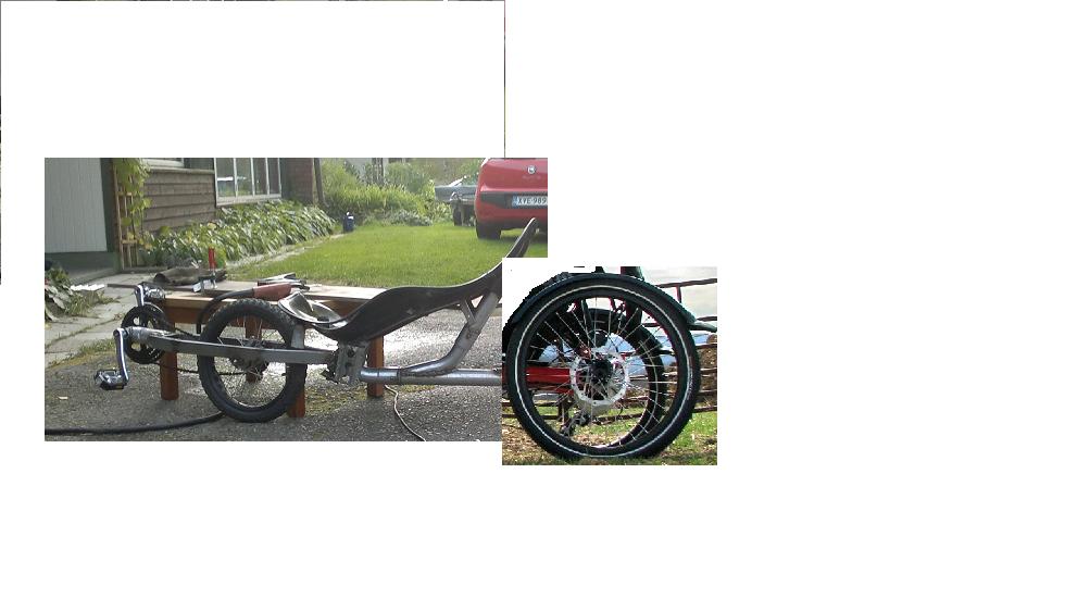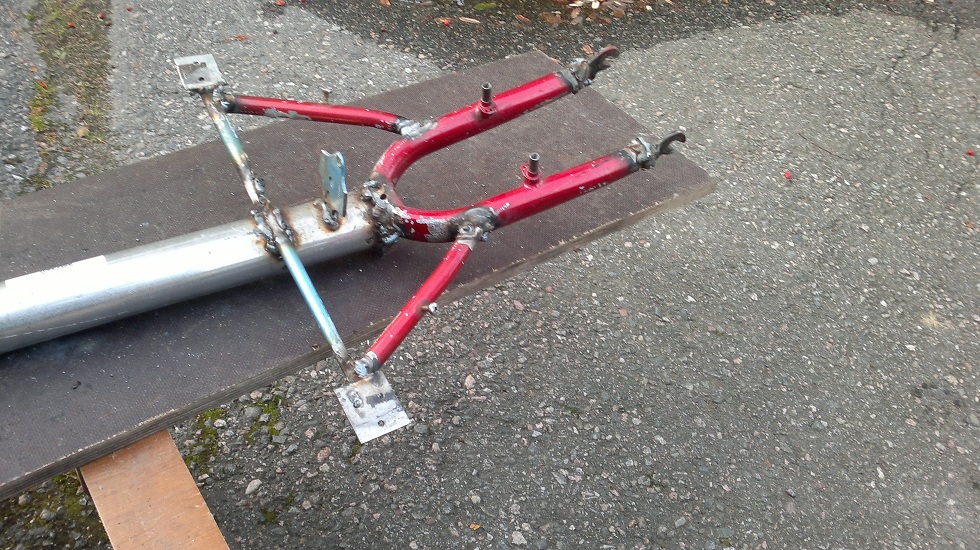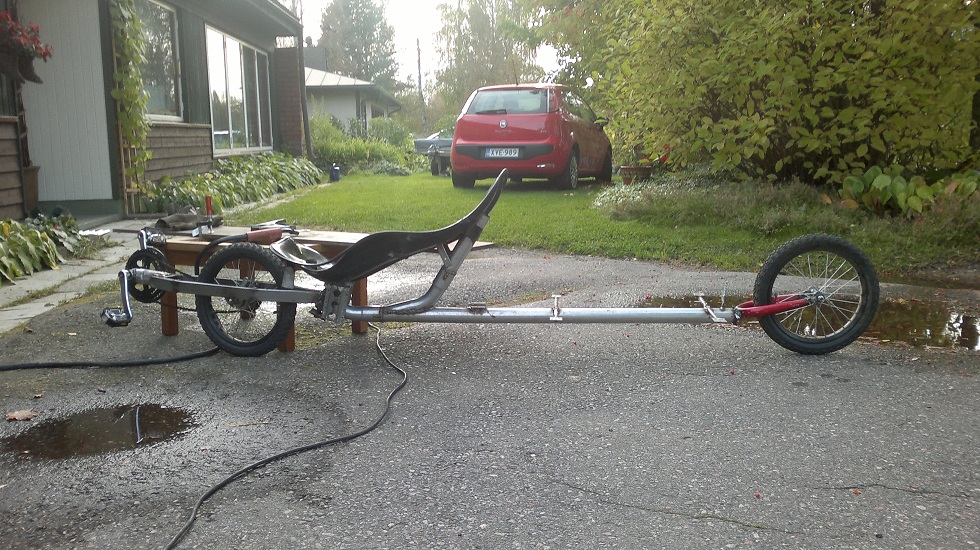 Tilanne on nyt kuitenkin vähän elänyt ja evvkoolle pitäisi tehdä vaihdettava takapää niin, että se muuttuisi kolmipyöräiseksi, ajattelin jotain lattarauta ratkaisua eli vanha pyörä penkin takaa poikki ja lattarauta putken päähän ja siitä neljällä pultilla uusi perä kiinni.