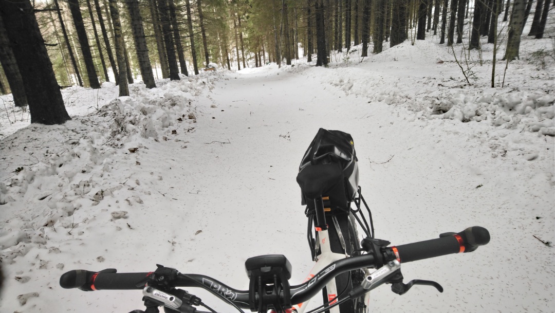 Meinasi vähän olla liukasta. Oli virhe pysähtyä tuolla tiellä, kun pyöräilykengissä ei ollut minkäänlaista pitoa. Kuvassa tuolla kaukana siintää junaradan ylikulkusilta. Sillalle noustaan sellaista suhteellisen jyrkkää mäkeä pitkin. Se oli ihan peilijäässä. Jos siinä olisi vetävältä renkaalta loppunut pito, niin ei olisi ollut muuta vaihtoahtoa, kuin valua mäkeä takaisin alas hakemaan lisää vauhtia, koska kävellen sitä ei olisi ylös päässyt ![]()