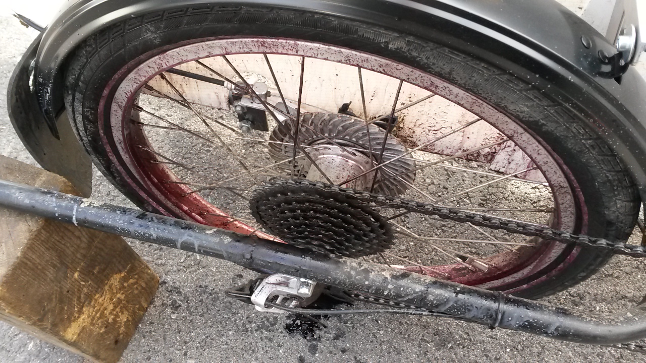 Takavanne, ketju ja vaihdepakka oli ihan mustassa sonnassa. Vävypojalla oli dragon's breath auton vanteiden pesuainetta, joka muuttuu kuulemma rautapölystä punaiseksi. Punaiseksihan tuo näytti menevän ja aika puhdaskin tuli.