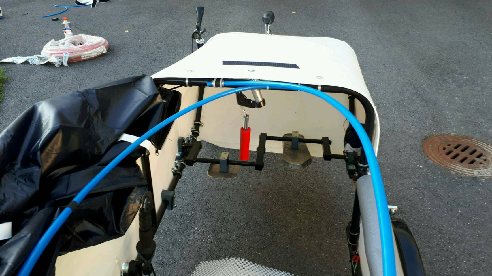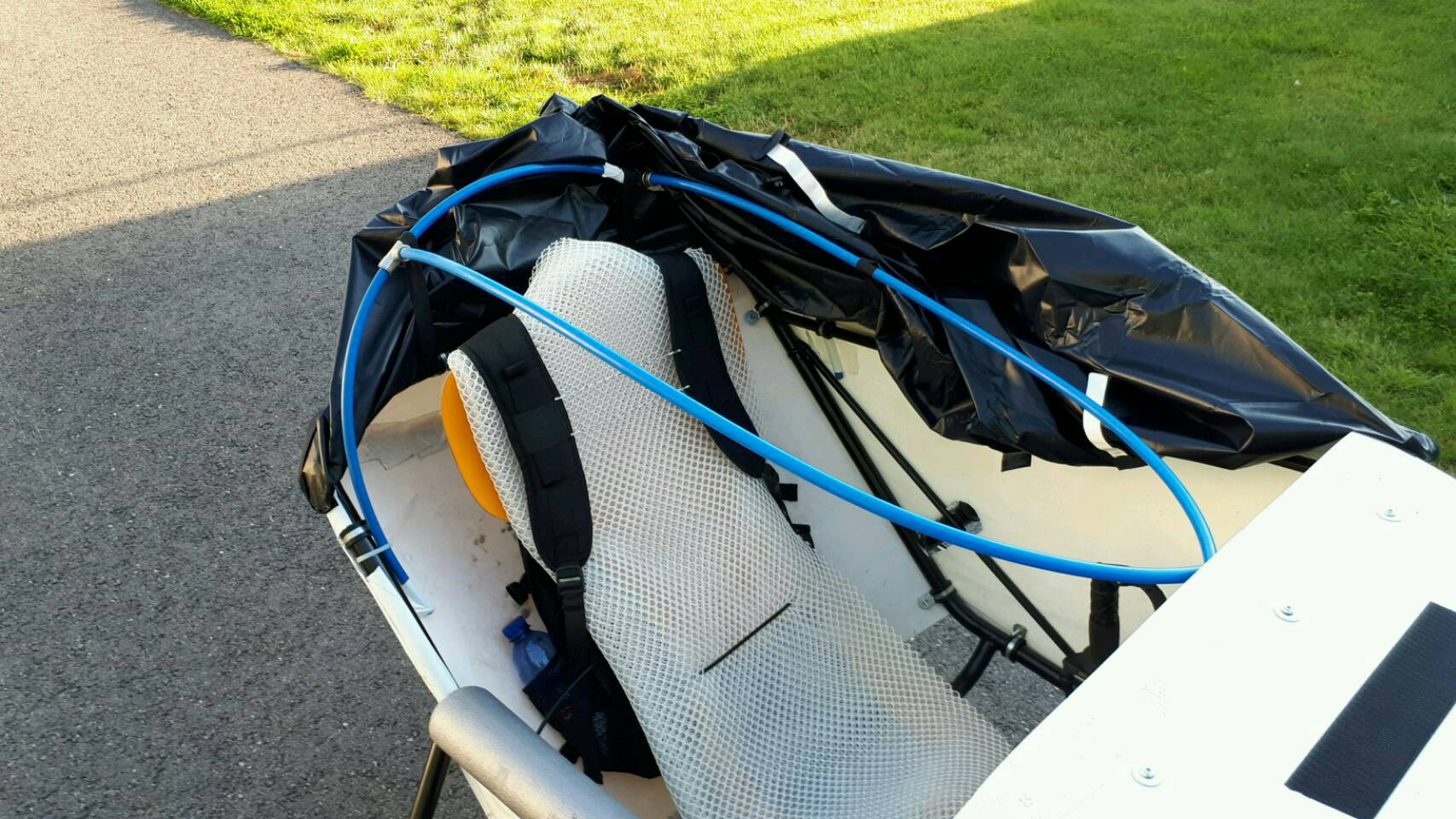 Tein paineilmaputkista kehikon, joka kannattelee viittaa irti hartioista. Oikeanpuoleinen putki on työnnetty etupäästään holkkiin, niin sen saa pois edestä, kun hyppii sisään tai ulos.