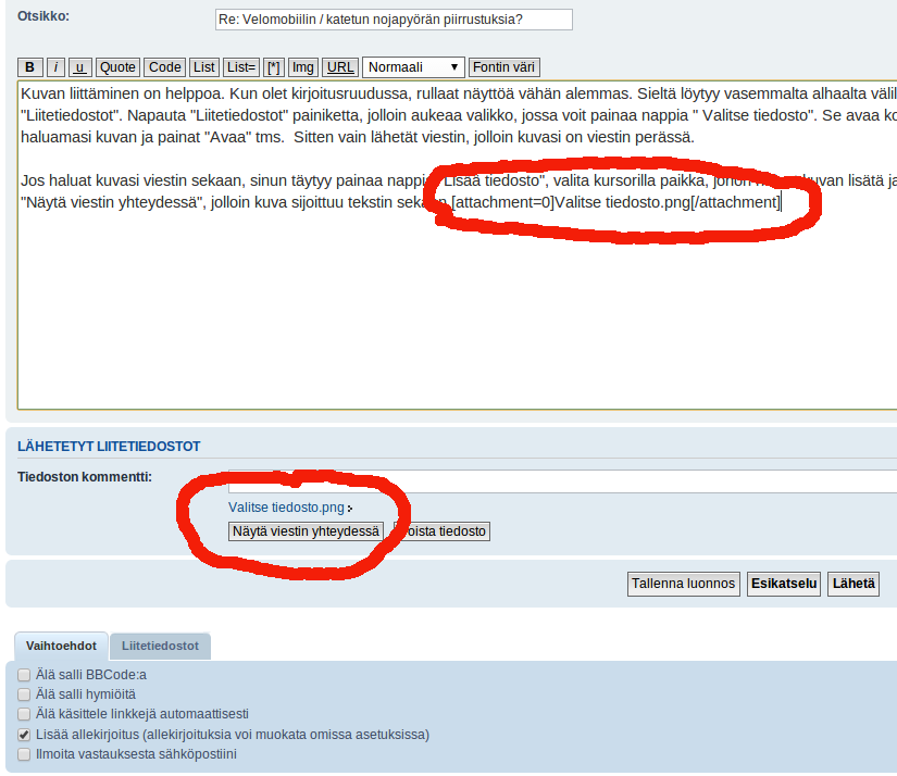 Jos haluat kuvasi viestin sekaan, sinun täytyy painaa nappia "Lisää tiedosto", valita kursorilla paikka, johon haluat kuvan lisätä ja painaa sitten näkyviin tulevasta valikosta "Näytä viestin yhteydessä", jolloin kuvalinkki "[attachnent=2]Valitse tiedosto.png[/attachment]" ilmestyy kursorin kohdalle tekstin sekaan.