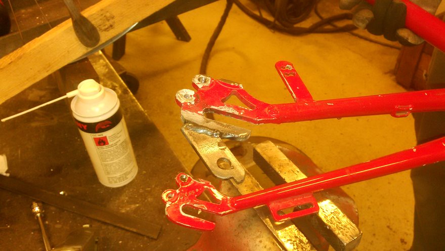 Toiseen päähän laitettiin holkinpätkä parilla ulkoputken kylkeen porattuihin reikiin hitsatuilla tulppahitseillä putken sisälle. Tuo on siis holkki , jonka yläpintaan kiilaa kiristävän pultin kanta tukeutuu. Holkki on 10 mm putken sisällä, jotta yhdysputki ei paina pultinkantaa, vaan istuu tukevasti putken istutuksessa. Pultti tehtiin M8 kierretangosta, jonka päähän hitsattiin mutteri.