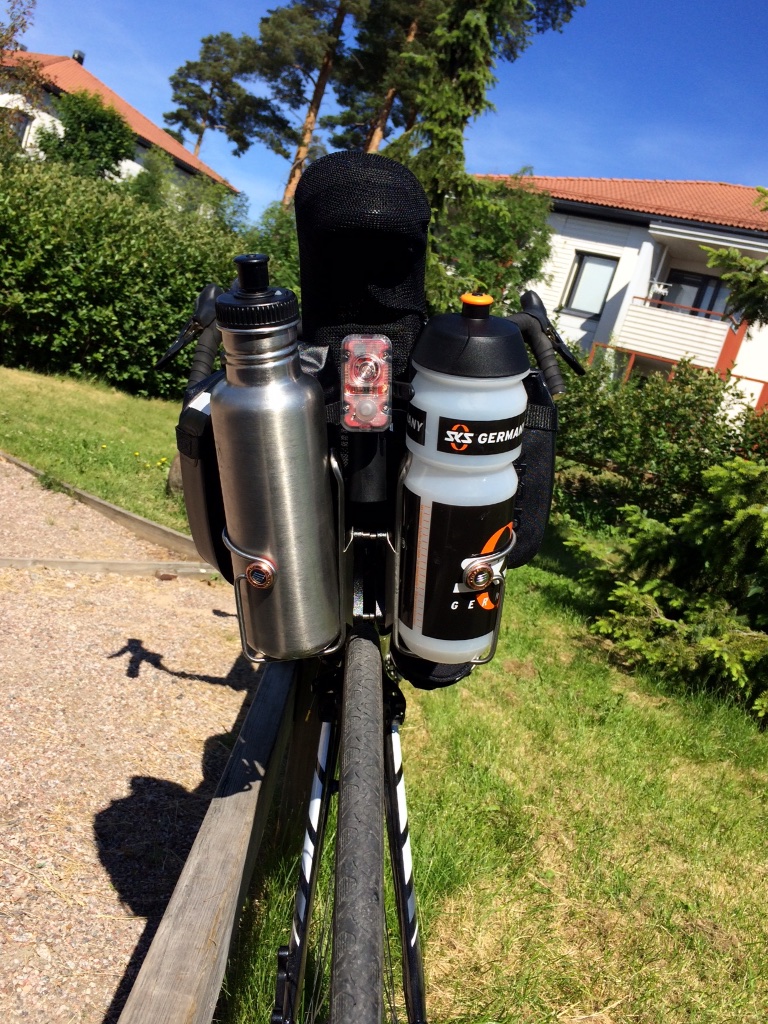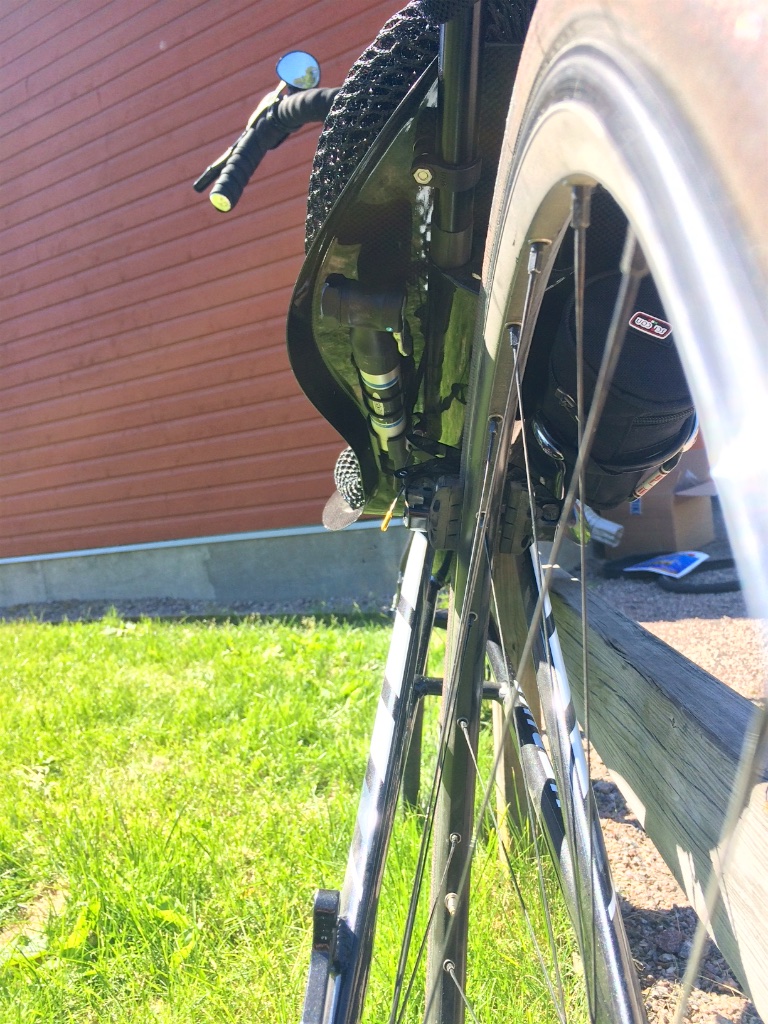 Aeromystiikkaa yritin huomioida myös pullojen ja varustepussukoiden asennuksessa. Yksi juomapulloteline on ohjauspuomin alapinnalla, jalkojen välissä. Penkin alla on toisella puolella pumppu ja toisella puolella pullotelineessä varagummit, paikkarasia ja työkalut.