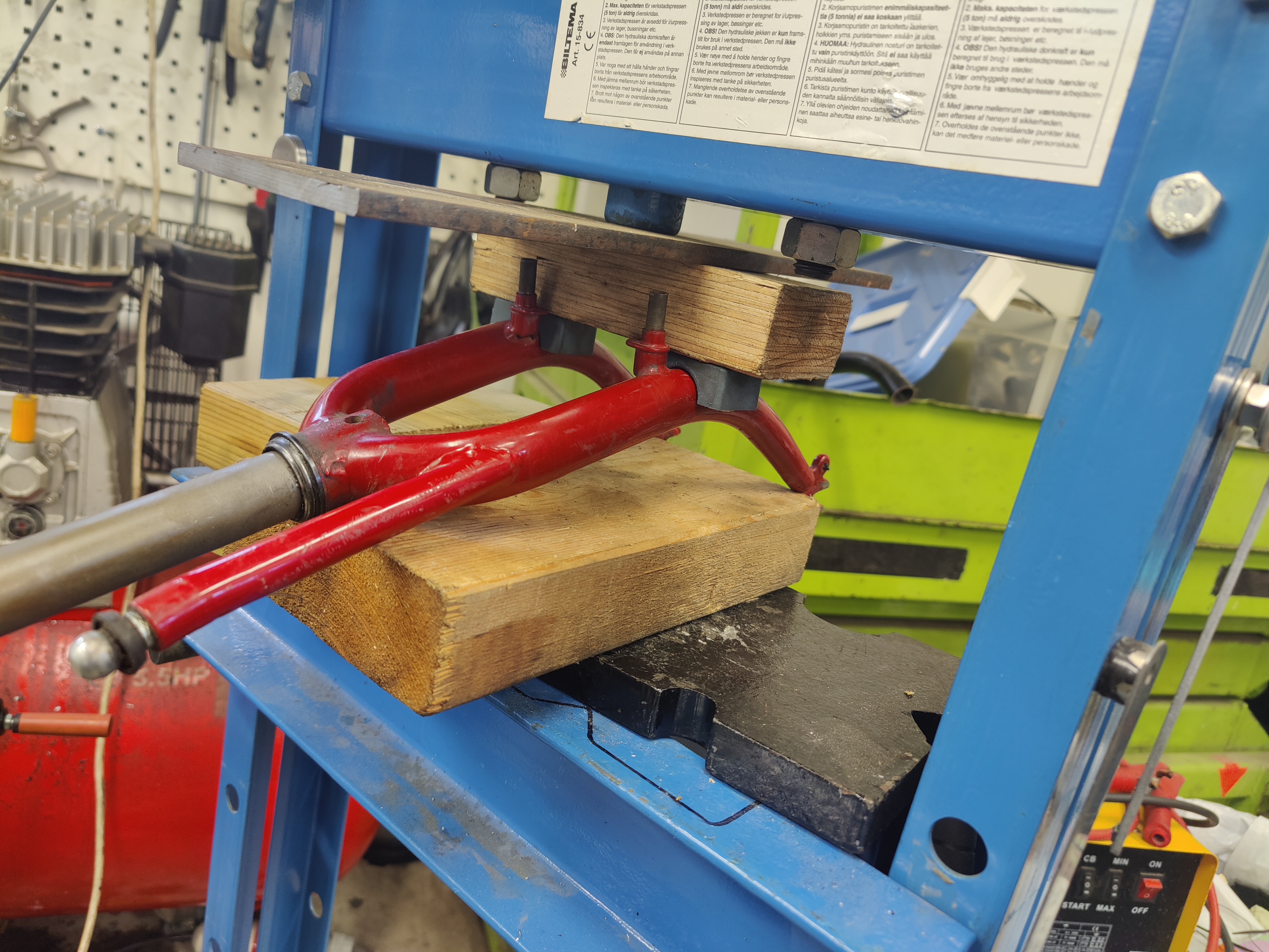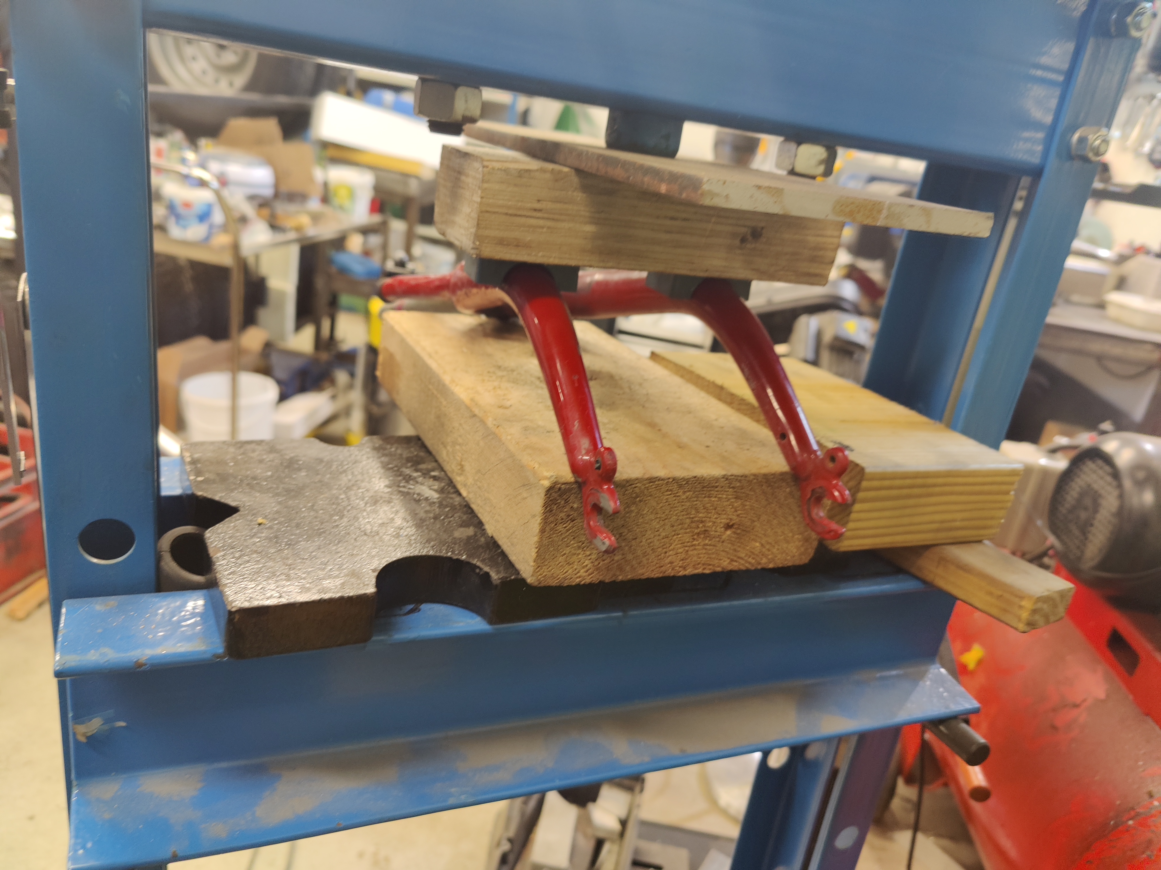 Prässi viritetty haarukan oikaisuun. Puuta ja muoviset stauffin puolikkaat pehmikkeenä.
