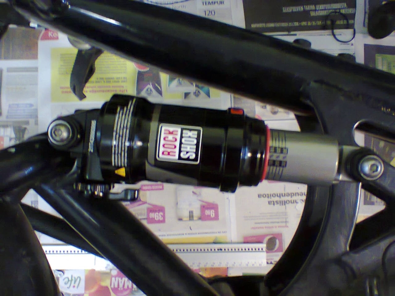 No niin sähläys jatkuu . Otin scorpionin oikein kunnolla työn alle ja ekana vaihtamaan iskarin parempaan, Rockshox monarch ilmaiskariin. No ei sitten mennyt kuin strömsössä tämäkään, luin scorpionin manuaalista netistä asennusohjeen ja ei se kyllä siihen mene sillä tavalla. Sähköpostia lähetetty et mites tää kuuluisi laittaa. Kuitenkin ihan oikea iskari tilattu, joten joku juttu tästä nyt menee ohi. Vai miten te laittaisitte tämän? Iskari on tahallaan tuolleen kiinnikkeiden päällä malliksi näyttämään miten asianlaita on...kokeilin laittaa sitä myös oikeaan paikkaansa, mutta kiinnikepultteja ei saa edes kiinni saakka koska iskarin lukitusvipu ja säätöpylpyrä osuvat haarukan putkeen.