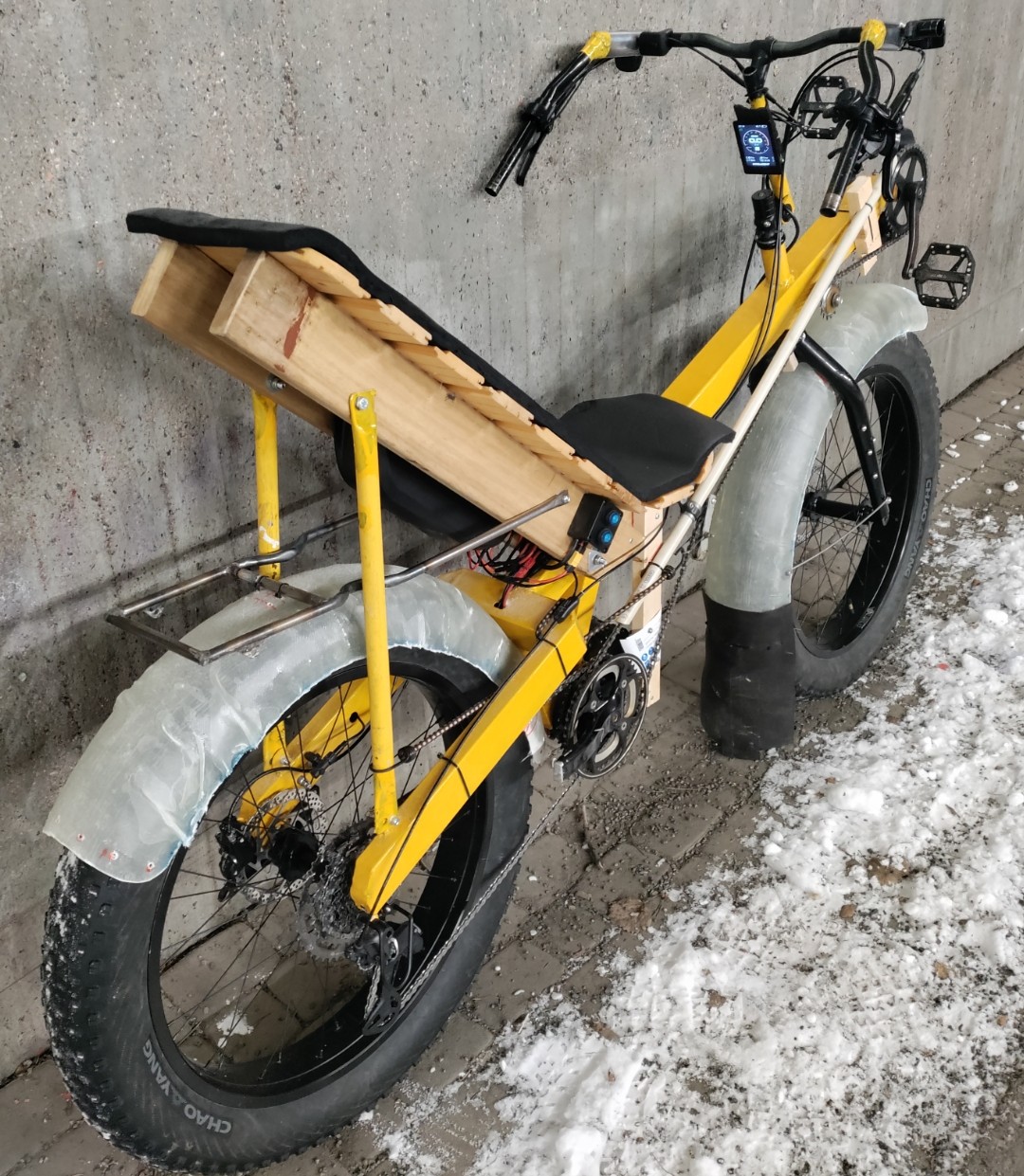 Alkaa olla valmista. Kuraläppä vielä taakse ja tarakan viimeistelyä... laitoin etuketjuksi kapeamman 7-vaihteisen, joka juuri vielä sopi näille 1-vaihteisille rattaille, ja se ratkaisi ketjun tippumisen. Noin 10km testilenkin ajoin.