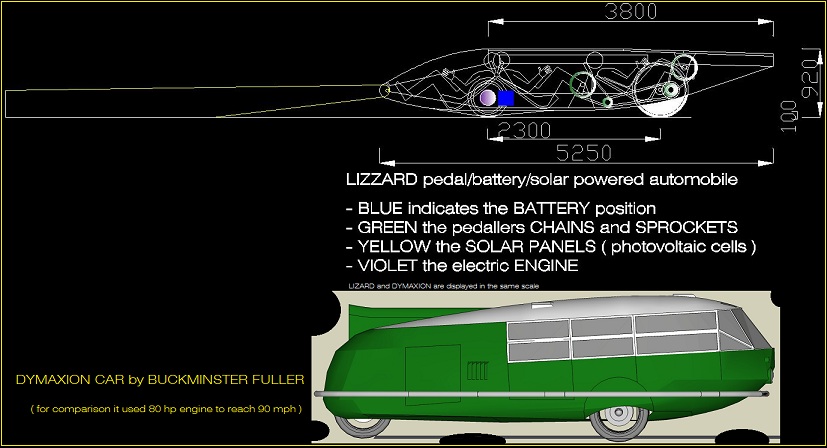Myöskin "streamlinerin" pilotille riittää latausta yksinajoon ilman polkimia..matkustajat polkevat oman liike-energiansa edestä. Mopon verran tehoa riittää juuri pilotille..mielestäni tämä on kätevä lähestyminen 4-paikkaiseen ( vai olisiko joku muu kätevämpi ? ).