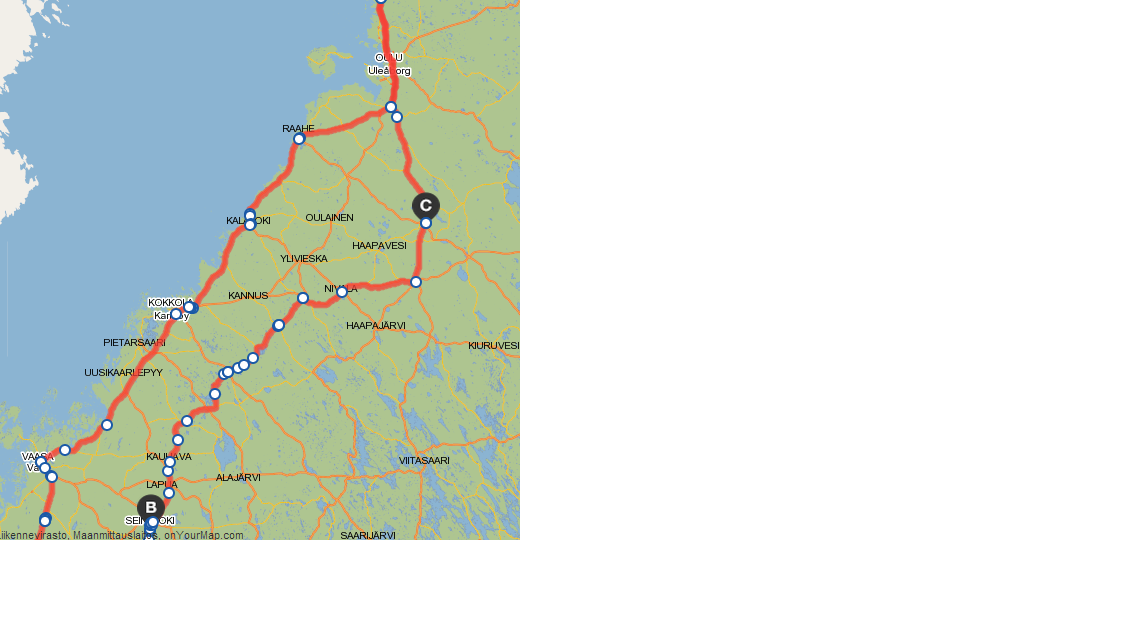 Koska suuri osa matkasta on Pohjanmaata ja alla on kinneri niin päivämatkaa olen hahmotellut 160 km mukaan. Viimevuoden reissulla oli kiva päivämatka 6 h ja siihen vielä tunnin tai pari polki kevyesti päälle jos halusi itseään asemoida parempaan paikkaan ja leppoisalla tahdilla 25 km/h keskari tulee ihan itsekseen, jos norminojapyörällä ja kärryllä tuli 22 km/h helposti keskinopeudeksi, nyt ehkä vielä kevyemmällä pyörä+tavarat kokonaisuudella :mrgreen: Aikatauluihin en aio kuiteskaan itseäni hirttää ja aikataulu sallii hyvin 3-4 välipäivää.