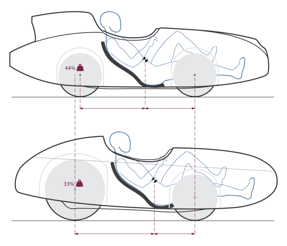 Vertailtu 3pyöräsen ja 4pyöräsen Questin painosuhteita, jos kuski istus takarenkaiden välissä sais vielä enempi painoo takarenkaille - no ehkä se ei oo tärkein ominaisuus, varsinkaan Hollannin oloissa.