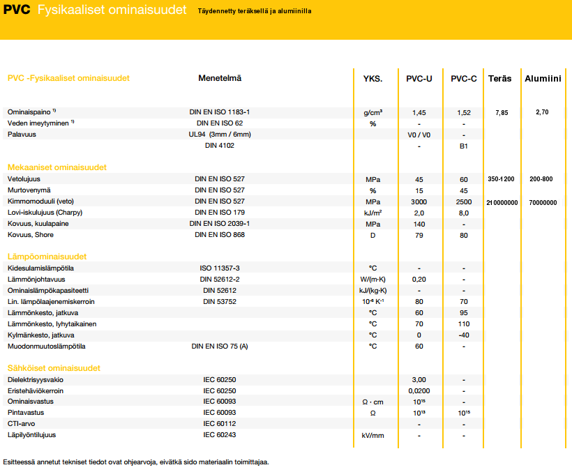 Vink Finlandin sivuilta löytyy hyvät materiaalitiedot kaikista myymistään muovituotteista. Täydensin kuvaan teräksen ja alumiinin.