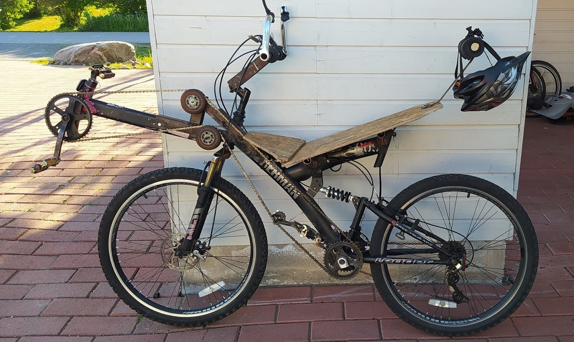 Olisin ehkä halunnut ensin koettaa rakentaa jotain matalaa pyörää jossa maataan aika selällään pyörien välissä, mutta rakentamisen haasteet ja laiska luonne pyrkivät menemään sieltä mistä aita on matalin.