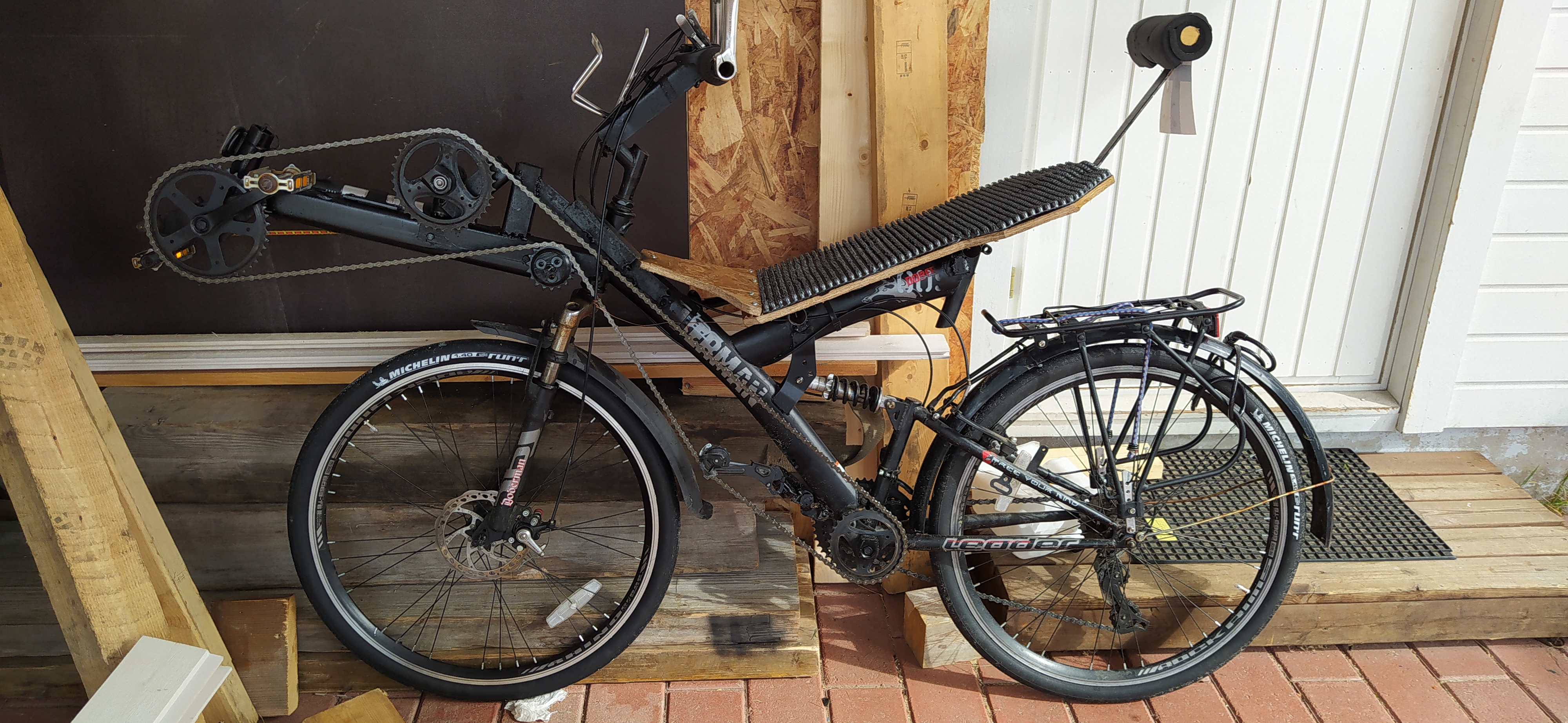 Pyörässä on moni asia tehty tyhmästi tai raskaasti tai muuten epäkäytännöllisesti, mutta käytettävissä olevilla osilla ja työmenetelmillä ei parempaa nyt syntynyt. Pyörä on ennemminki testiversio kun lopullinen pyörä ja tarkoituksena on kokeilla onko nojapyöräily minun juttu ja jos on, niin onko minun nojapyörä tämäntyyppinen vai pitäisikö jonkin olla toisin.