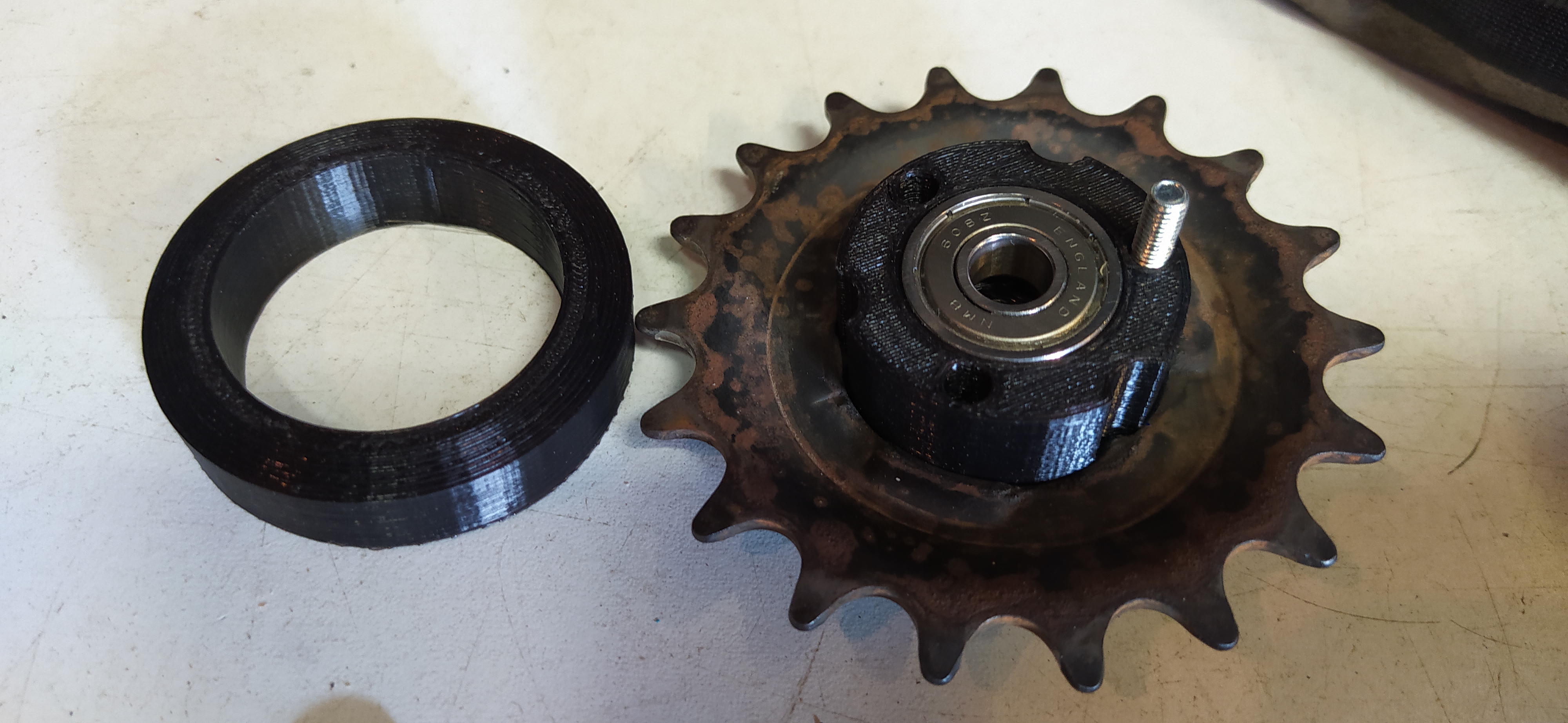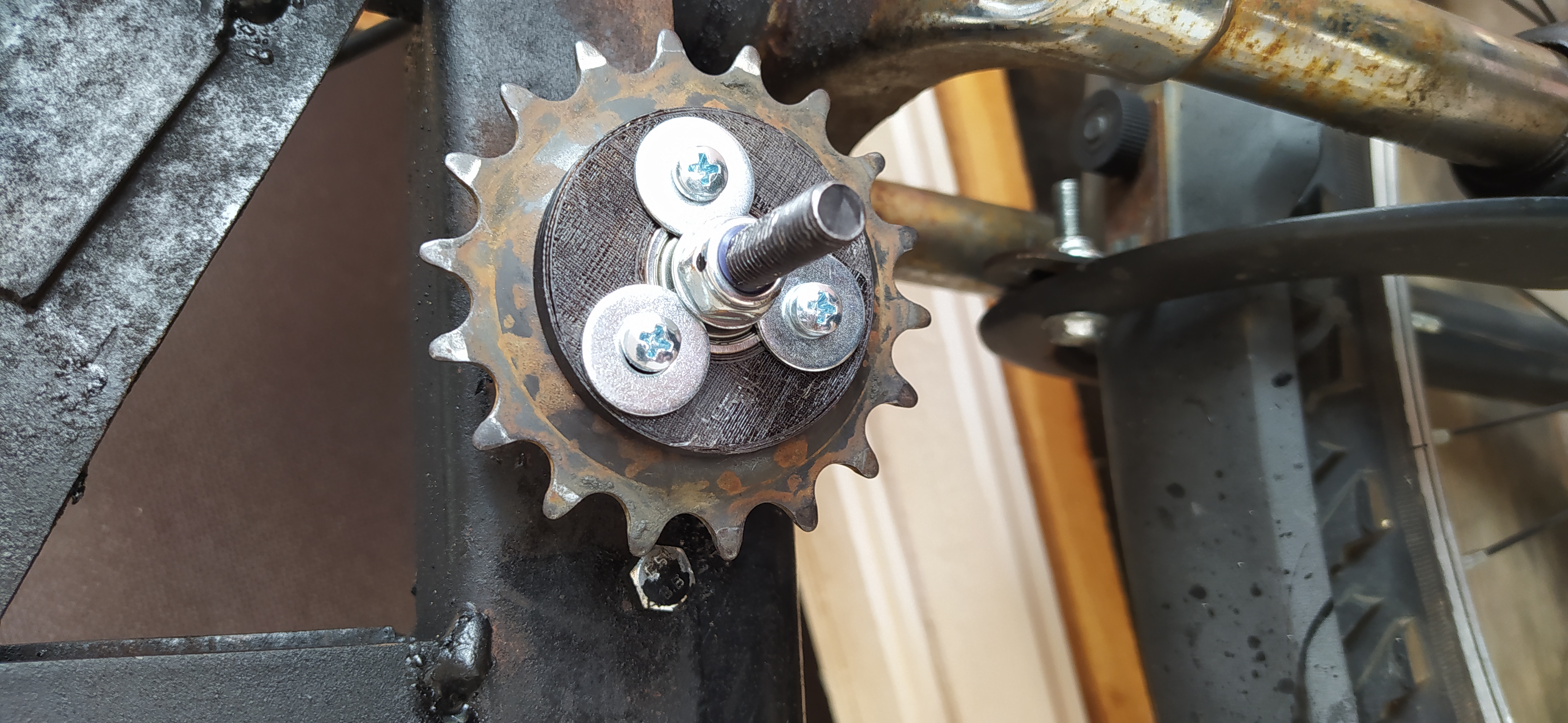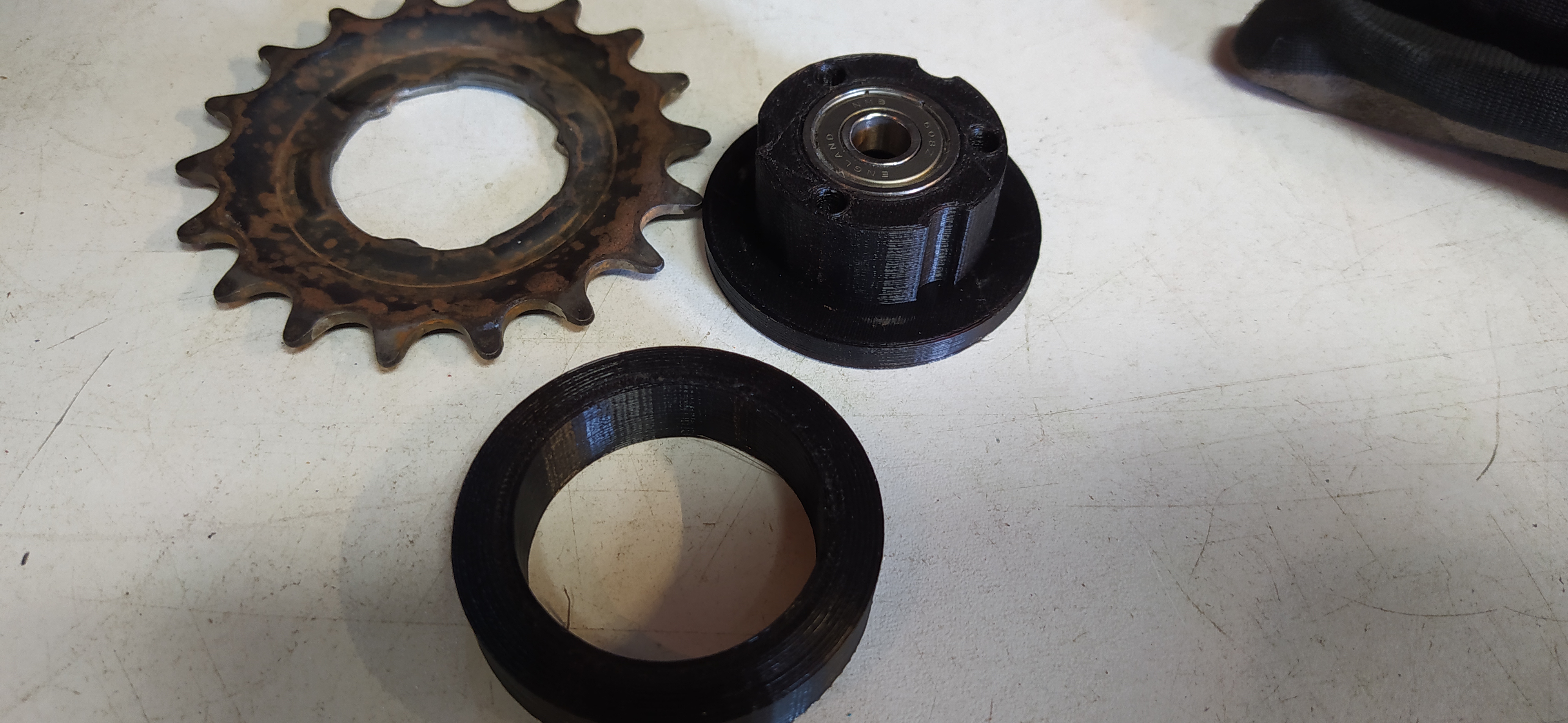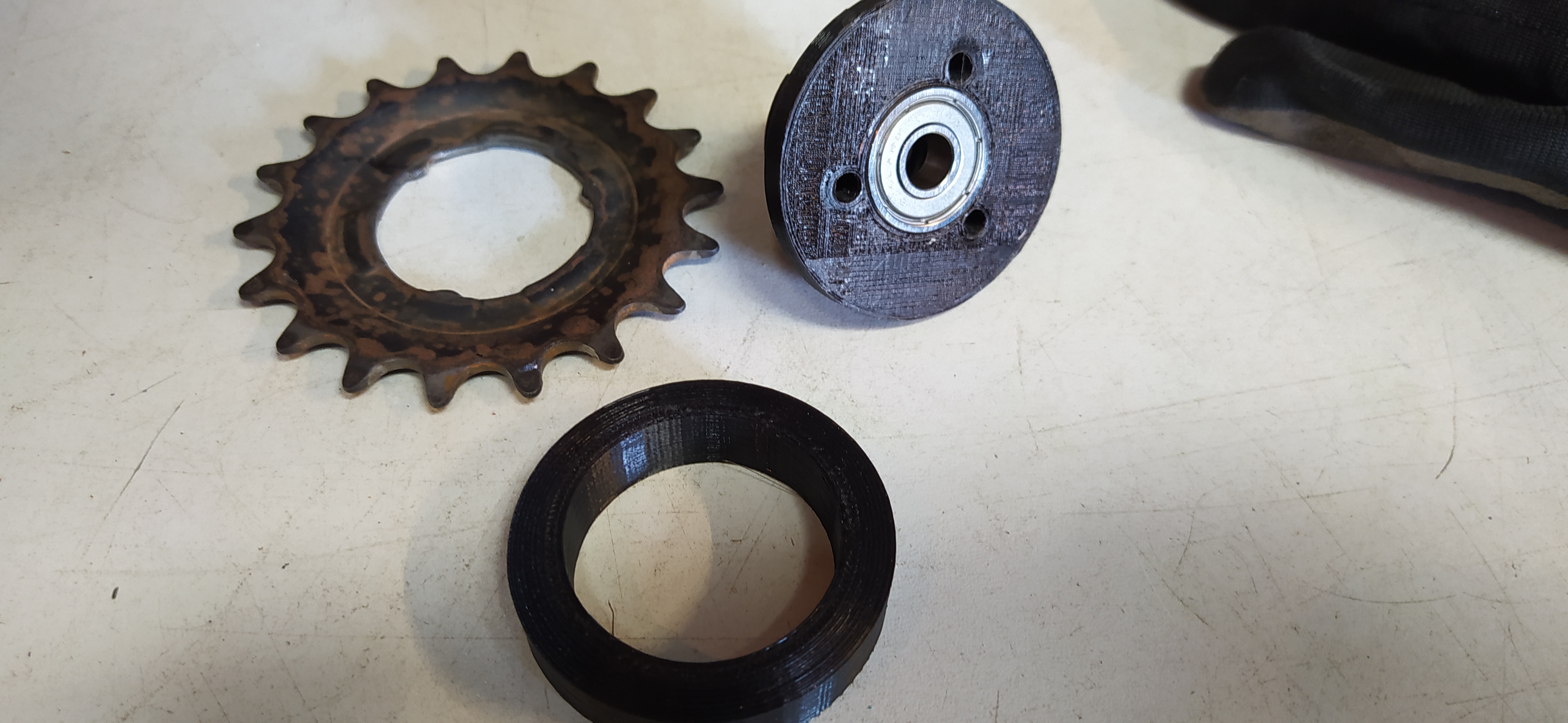 Ketjun taittopyörinä on potkulaudan renkaat, joihin on rälläkällä ajettu ura keskelle(Työtapaa en suosittele, itse taittopyörää tuntuu toimivan. Ainakin on hiljainen).