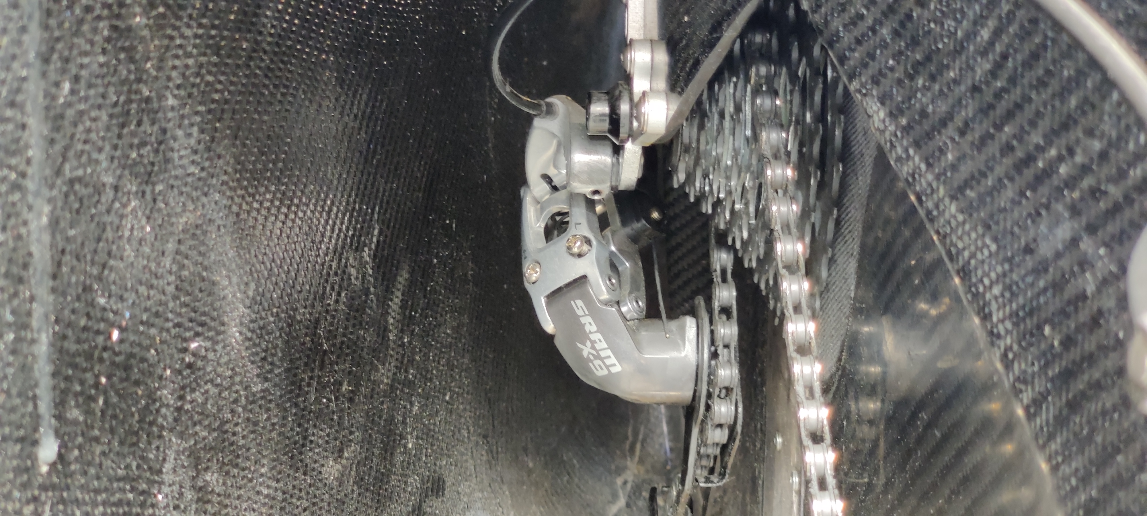 - voimalinja 2*9 vaihdetta, sram x9. Edessä 39/65, takana 11-36.