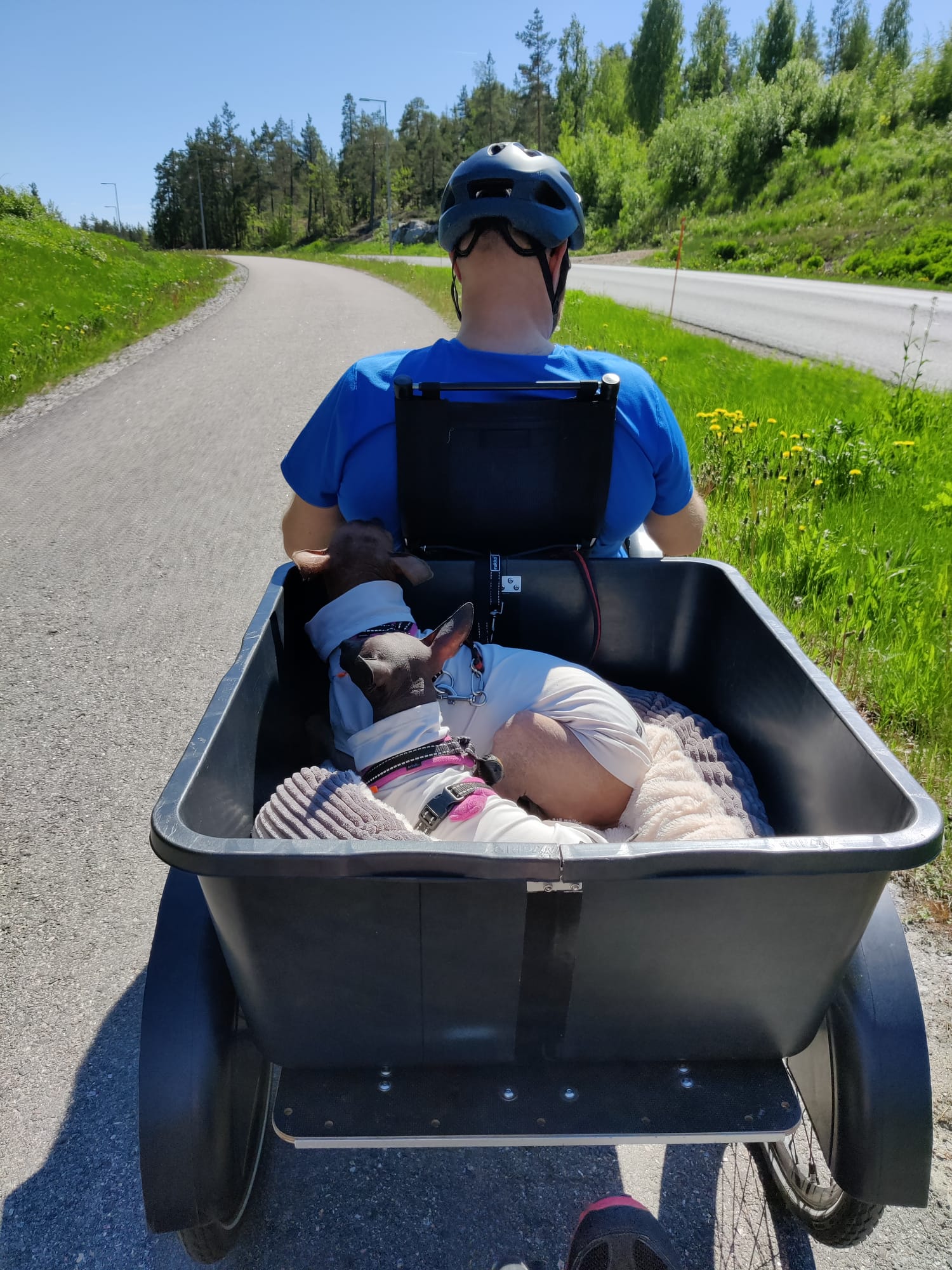 Pyörän käyttökokemukset on olleet oikeastaan vain positiivisia, mutta veikkaan että jos pyörän ostaa karvalakki vaihteistolla niin pettyy, koska se on vielä hieman pienemmällä skaalalla varustettu kuin oma ratkaisuni. Itse ostin sen ilman vaihteistoa ja virittelin siihen nexus 8 vaihdenavan jota Teppo muokkasi niin että pinnalaippaan saatiin 104 BCD ratas jota hän esittelikin aikasemmin. Itse vaihteisto on juuri ja juuri tarpeeksi suurella skaalalla varustettu. Eli sillä pääsee ilman kummempaa lastia jyrkätkin mäet jos pito riittää ja yläpäästä se loppuu n. 120 kampikierroksella 35 km/h vauhdissa, ja sen saavuttaa yllättävän helposti. Pito onkin ainoa asia jota tuo pyörä jäisi kaipaamaan jos tuota yrittäisi talvipyöränä käyttää. Eli sellaiseen käyttöön ehdottomasti lyhyempi akseliväli, mutta suosittelen silti HD-versiota siitä lyhyemmästä koska lavaa voi jatkaa tai vaihtaa pidemmän. Vakiolavan pituus on suunniteltu niin että pyörä on helppo säilyttää pystyssä siirrellä takapyörien varassa ahtaissa tiloissa.