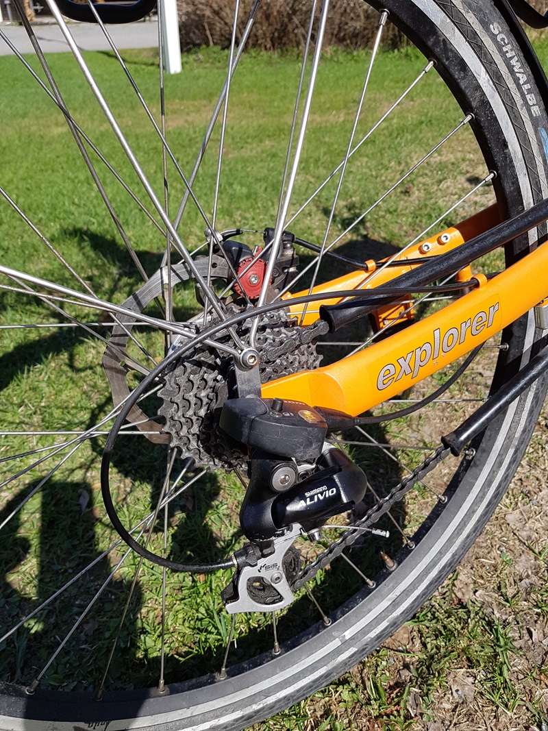 • Vaihteet: SRAM DualDrive II, eli navassa SRAM 3x napavaihteet, ja sen lisäksi Shimano Alivio 8x lehtivaihteet. Edessä ei ole vaihteita, vain yksi ratas. Jotkut ovat laittaneet eteenkin vaihteet, jolloin vaihteita saa lisääkin. Tässä sitä ei kuitenkaan tarvitse.