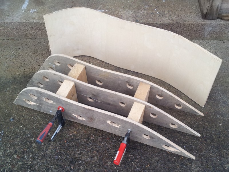 Liimaus tapahtuu leikkaamalla 4mm vanerista kolme 30x90cm suikaletta ja laittamalla niiden väliin puuliimaa (kosteudenkestoluokka d3). Sitten vain puristetaan koko nippu muottia vasten ja jätetään kuivumaan. Kunhan ei auo liian aikaisin kopioituu muotin muoto täydellisesti vaneriin :) Ennen aukaisua olen siirtänyt muotin suunnan aihioon, jotta sahaus ei mene muotoon nähden vinoon.