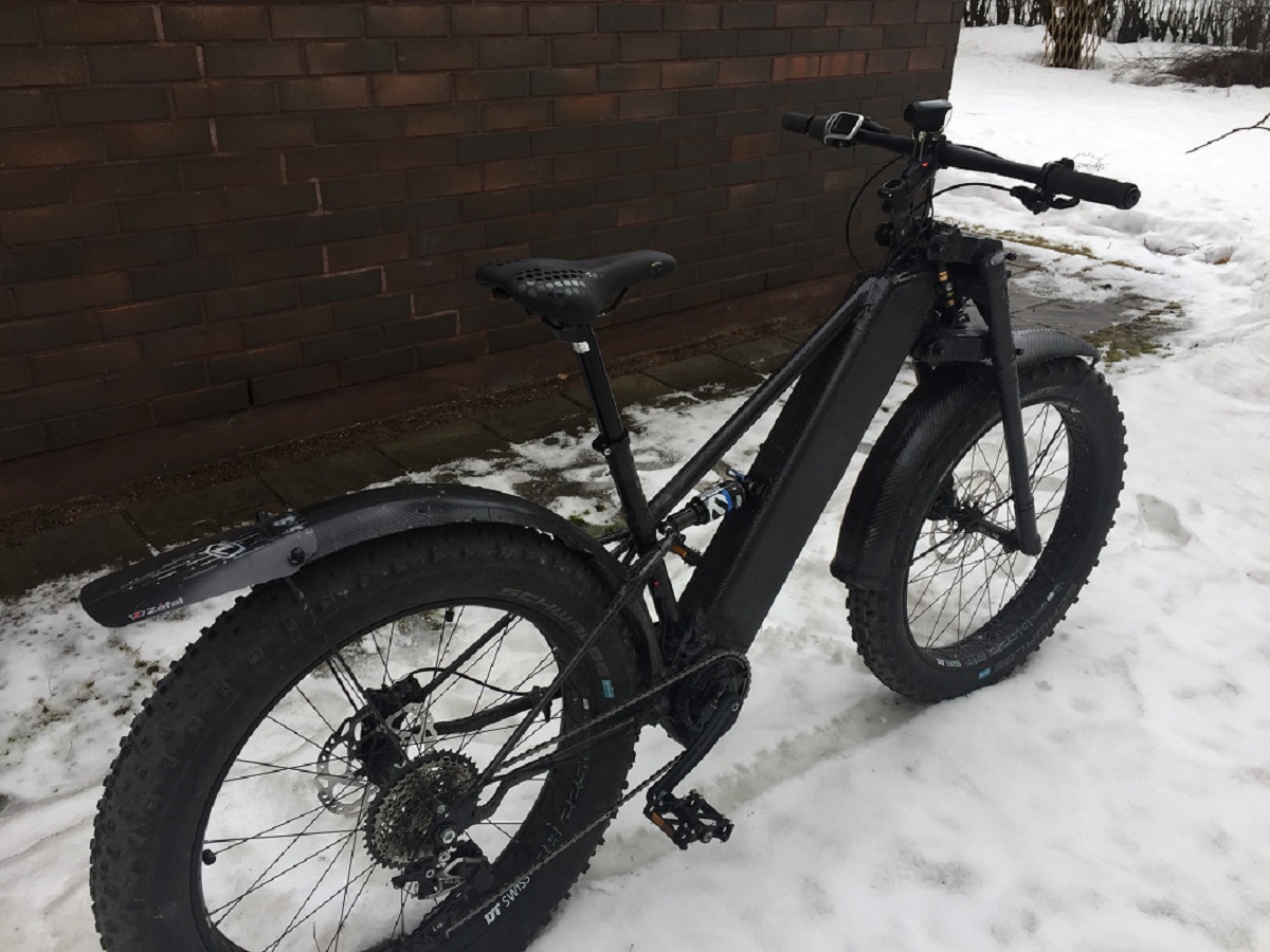 Takahaarukan tein 12 mm hiilikuituputkesta, niitä on kaksi päällekkäin alimmissa varsissa. Lokasuoja on kantavaa rakennetta, siinä on sandwitch levy sisällä. Rungon pääosa on neljästä putkesta ja se on mitoitettu niin että akut sopivat sisään. Bottom bracket on 100 mm ja ns lugged eli hitsailin siihen kiinni putkien kiinnityskorvakkeet ja moottorin kiinnityskorvakkeen.